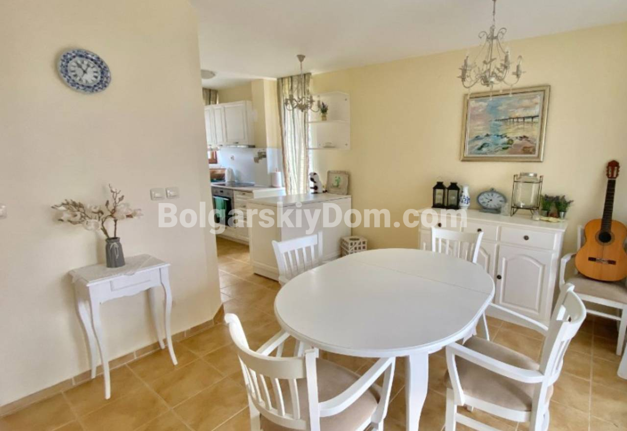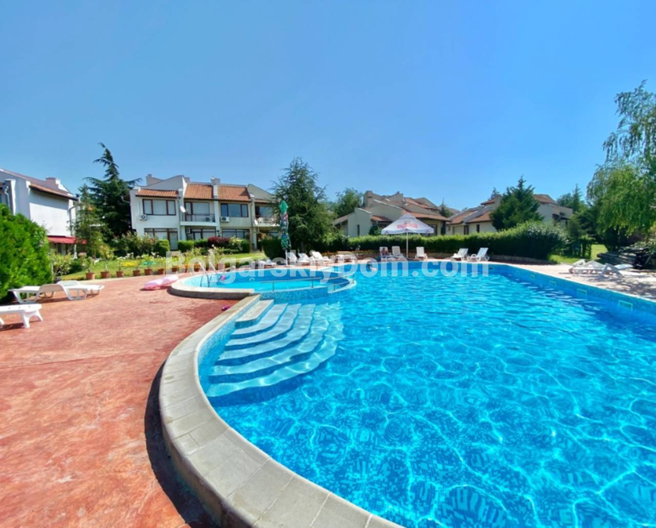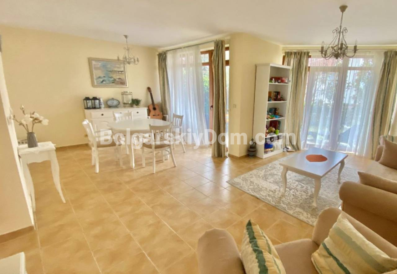 В каталоге появилась двухэтажная вилла в престижном комплексе Алмонд Хилл Виллас в Кошарице - просторный дом с хорошей ориентацией вдали от туристической суеты. Общая площадь 140 кв.м., угловое расположение позволяет использовать участок максимально эффективно. На первом этаже - просторная гостиная, кухонная зона, столовая и оборудованный санузел. Вдоль всего первого этажа тянется открытая терраса с видом на озелененный двор комплекса - розы, цветники, березы, ели и лаванду. Второй этаж - два отдельных спальных помещения, каждое со своей ванной и туалетом, две дополнительные террасы. Вокруг виллы зеленая зона отдыха с мебелью, качелями и зоной барбекю. Дом продается полностью обставлен и оснащен техникой, кондиционеры во всех комнатах. Южная ориентация окон. Построена в 2010 году, в 2023-м обновлён фасад. Акт 16.