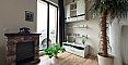 На первом этаже: коридор, санузел с душевой кабиной и просторная гостиная с панорамными окнами, наполненная естественным светом. Зона отдыха с диваном ориентирована на море, кухня угловая, с барной стойкой, плавно интегрирована в общее пространство. Из гостиной есть выход на уютную крытую террасу - идеальное место для утреннего кофе или вечернего отдыха с видом на море.