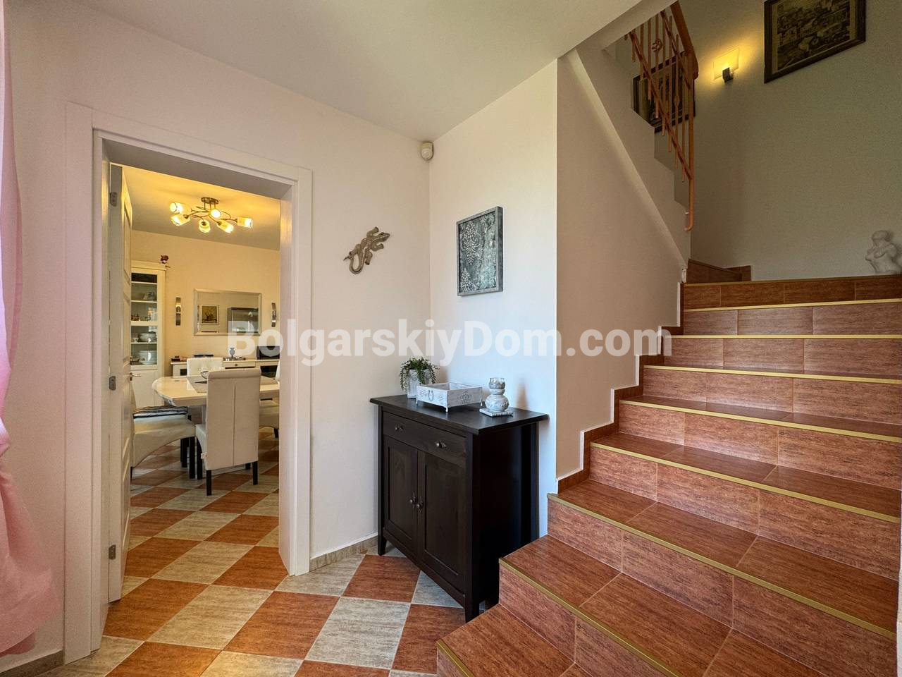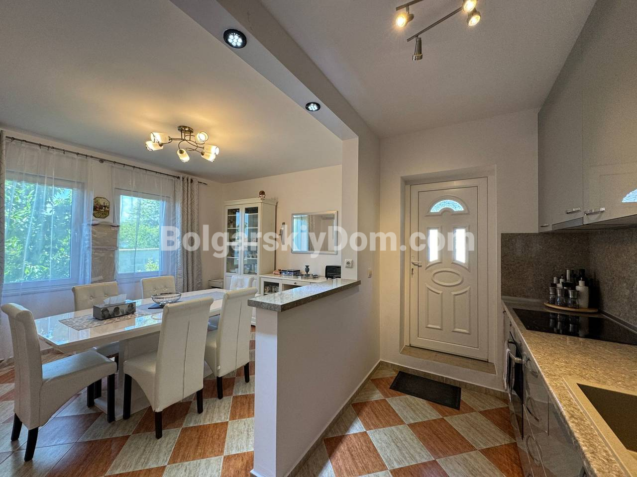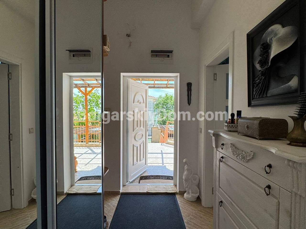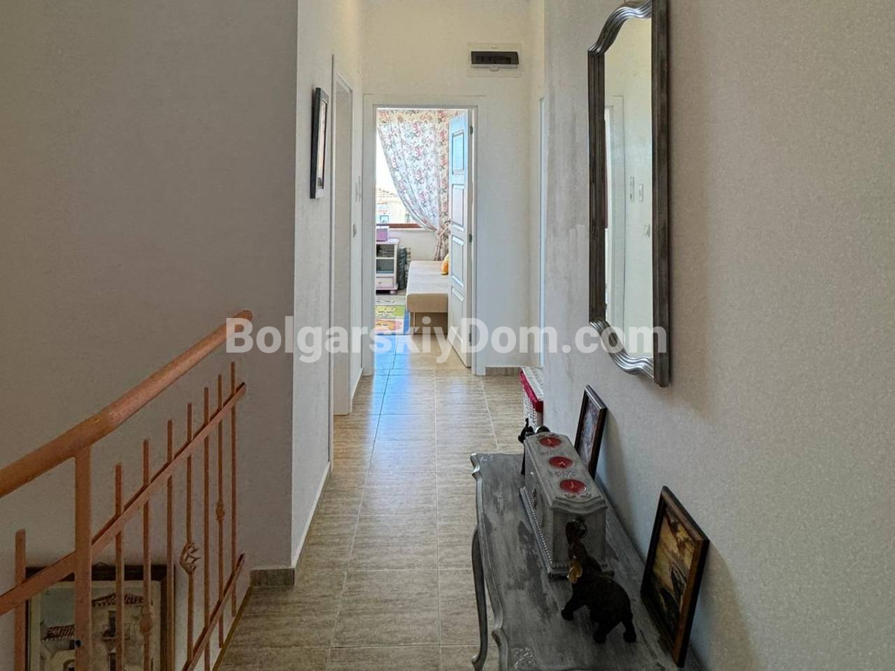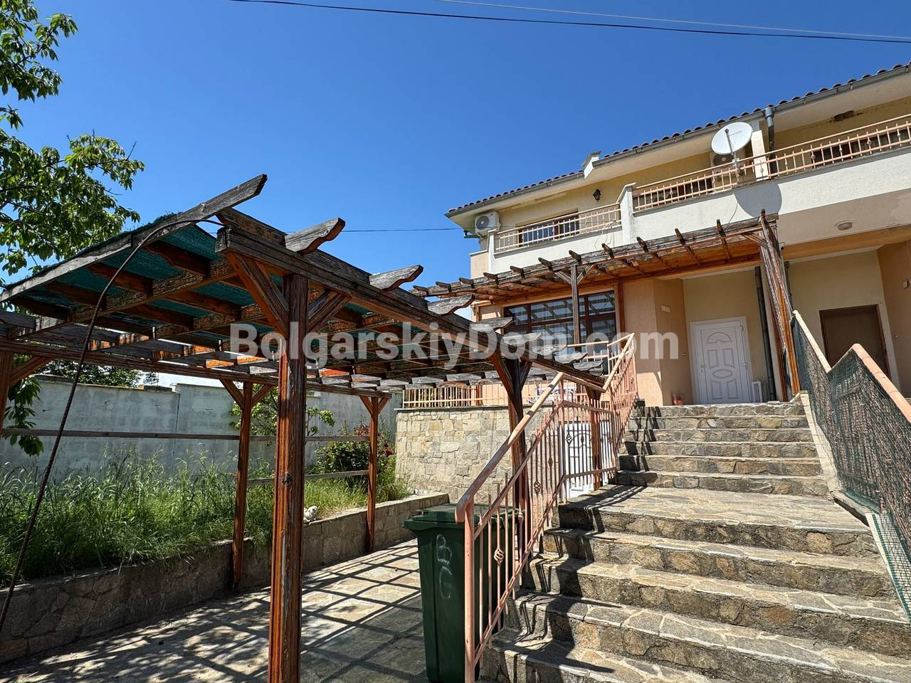 Болгарский Дом презентует отличный вариант автономной недвижимости! Представляем вашему вниманию стильный двухэтажный таунхаус в самом сердце Кошарицы, который уже доступен для покупки! Дом площадью 163 кв.м с участком 299 кв.м, два этажа, которые суммарно включают пять комнат, из них три уютные спальни. На первом этаже прихожая, санузел, просторная гостиная с камином, обеденная зона с кухней, маленькая кладовая под лестницей и выход на задний дворик. Второй этаж с тремя спальнями, одной (мастер) с личным санузлом с ванной и теплым полом, отдельным санузлом с душем и огромной террасой, открывающей вид на поля и окрестности. Под первым этажом — просторный склад. Дом частично меблирован, оснащен техникой и кондиционерами, подключен к центральному водоснабжению, канализации и электричеству. Часть мебели и текстиля остается при продаже, на участке парковка для двух автомобилей.