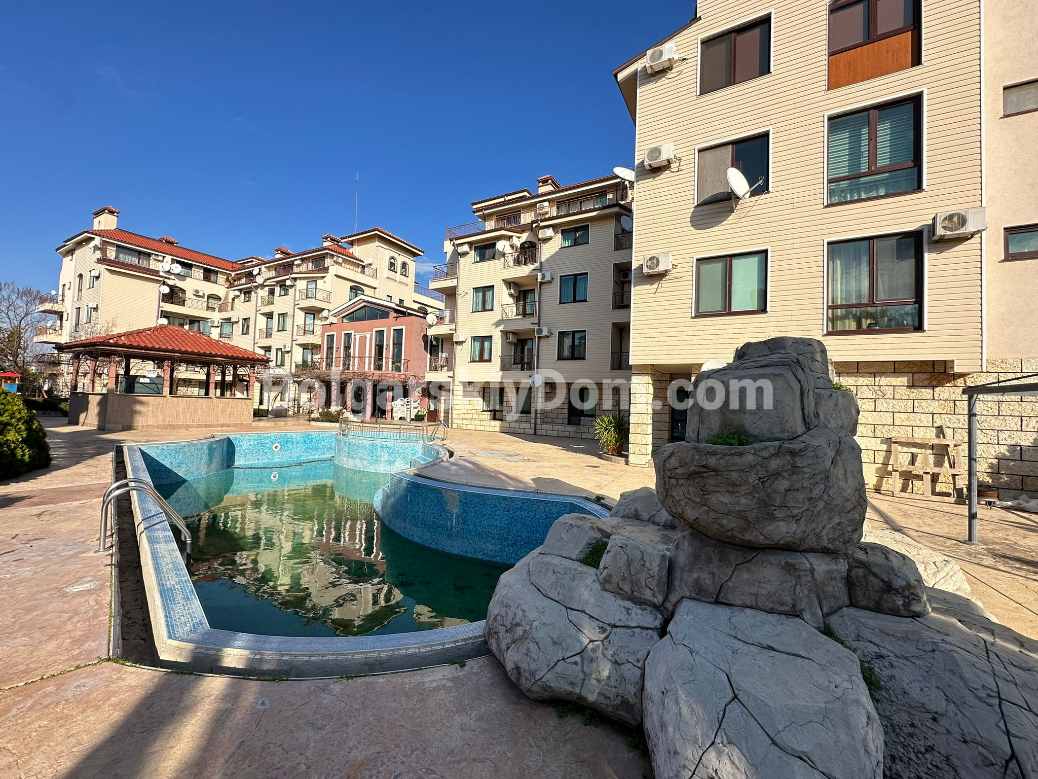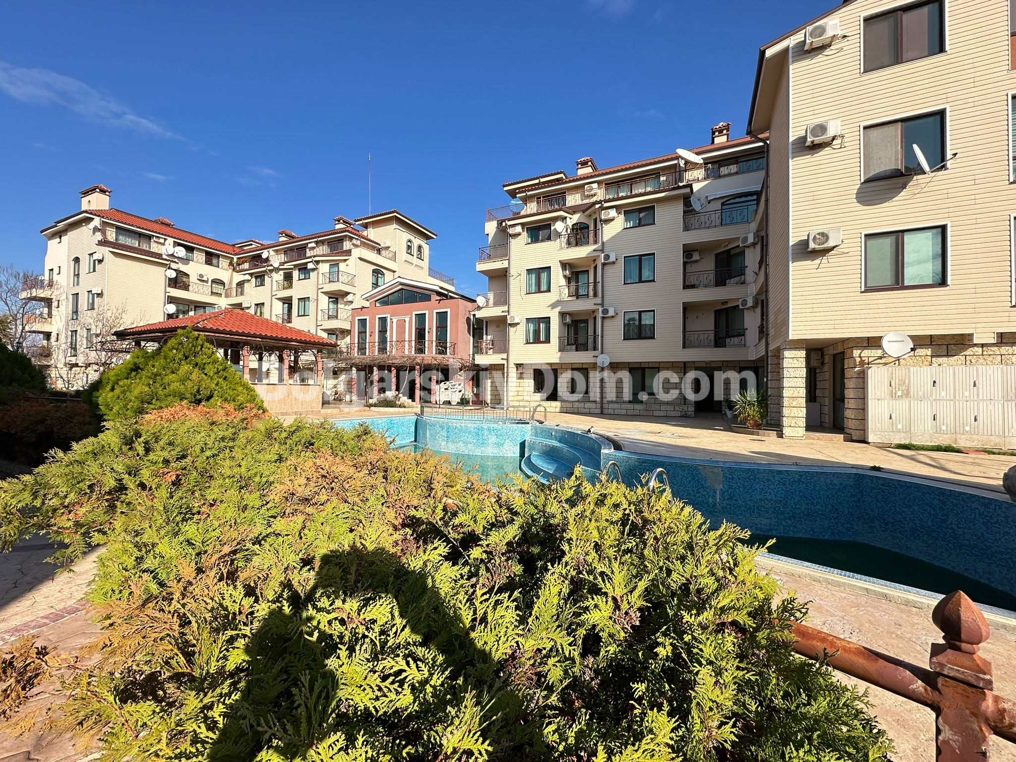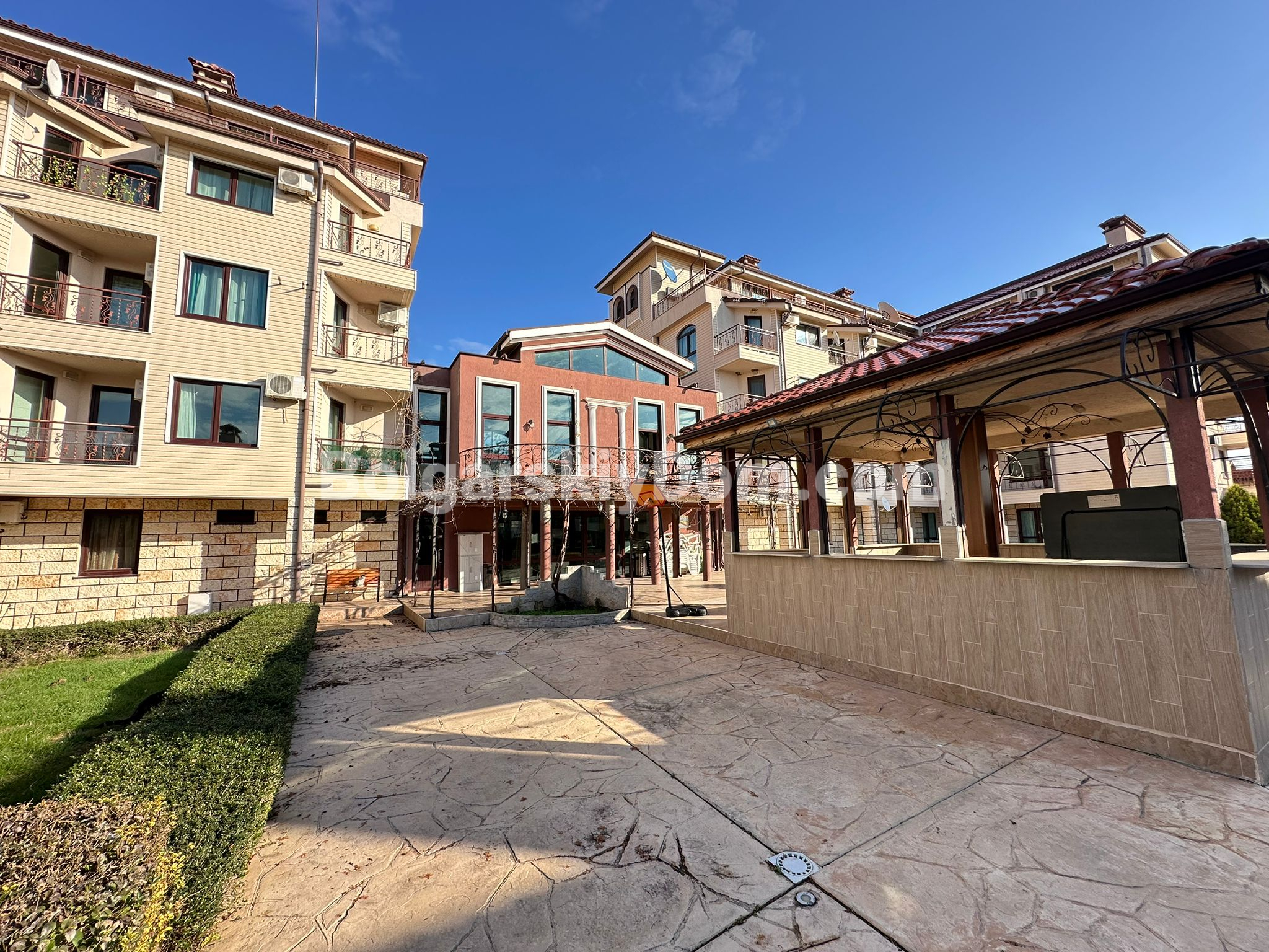Комплекс "Свети Никола" расположен в 2,5 км от моря, в тихой части курорта, что идеально подходит для спокойного отдыха и жизни. Вокруг комплекса имеется вся необходимая инфраструктура: продуктовые магазины, кафе и транспортные остановки, обеспечивающие легкий доступ к морю и удобствам Солнечного Берега. Уютная атмосфера и комфортная инфраструктура.