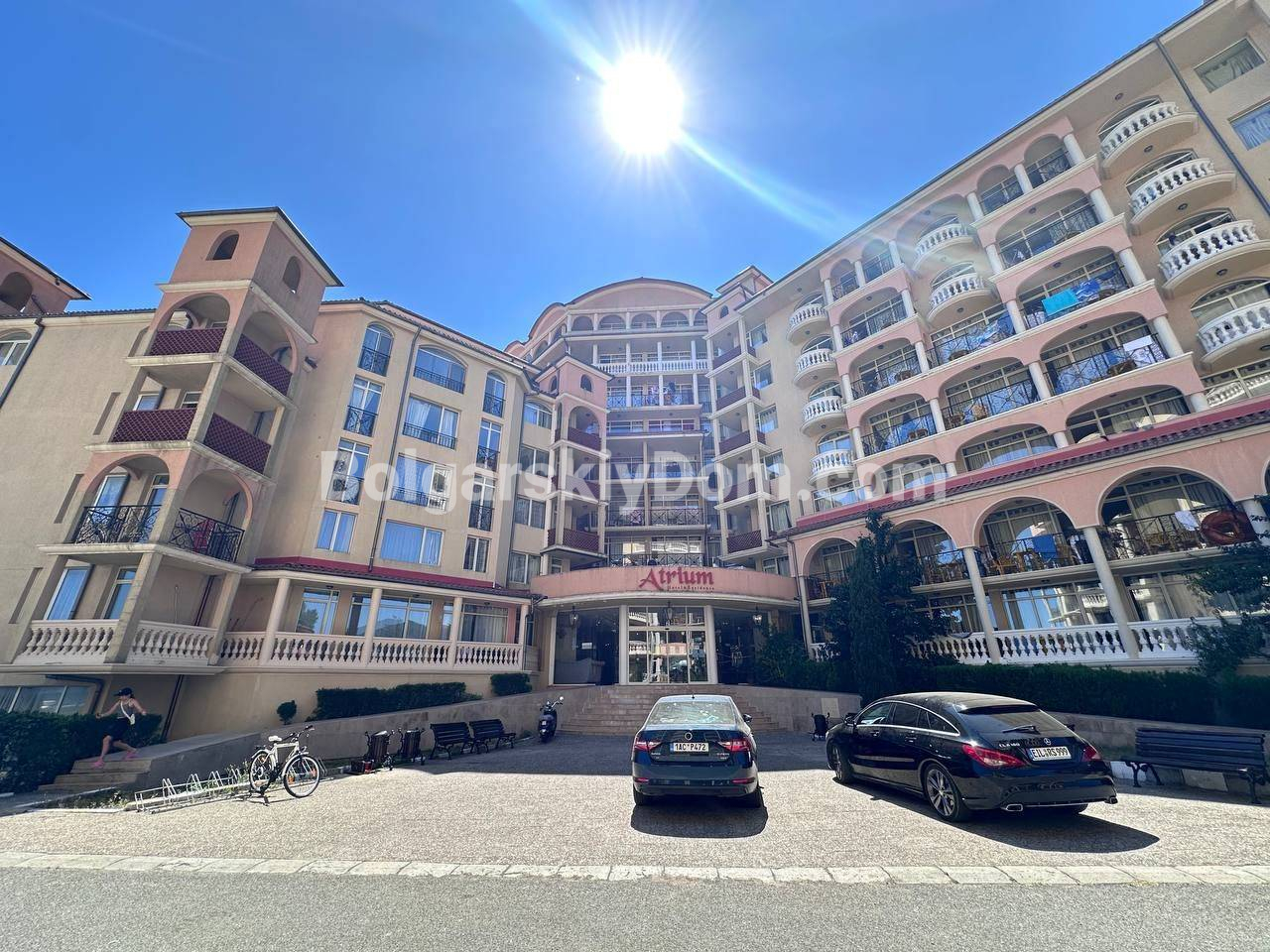 Комплекс Атриум Бич находится всего в 50 метрах от пляжа, который начинается буквально за территорией. На ухоженной, озелененной и безопасной, на ней есть: несколько бассейнов с детскими секциями, зоны отдыха, шезлонги, круглогодичная охрана. В шаговой доступности — магазины, кафе, остановки транспорта, расстояние до соседних курортов на авто не превышает 10-15 минут. Умеренная такса всего 10 евро/кв.м в год.