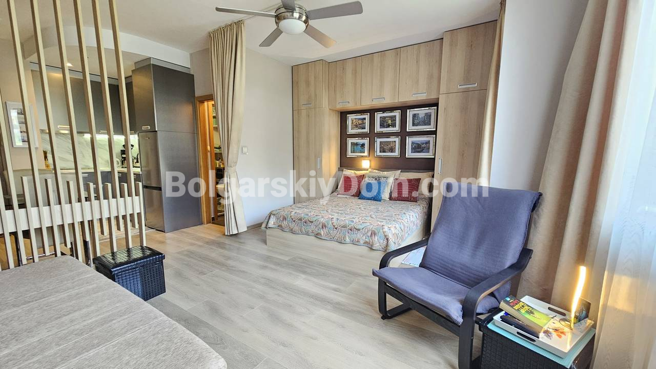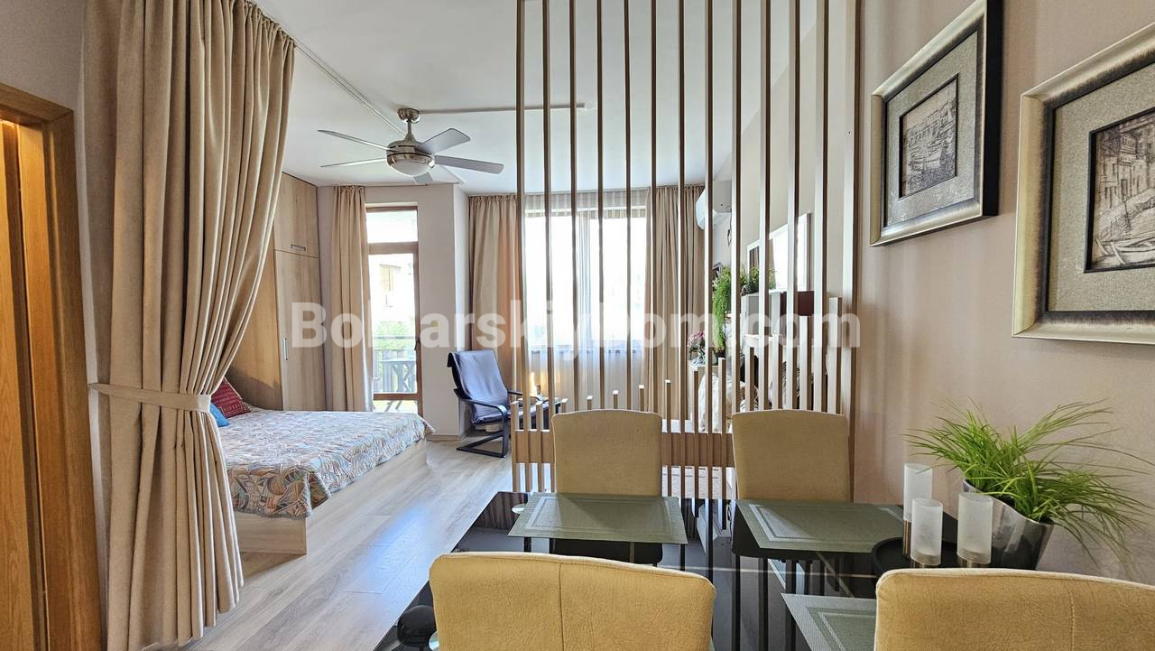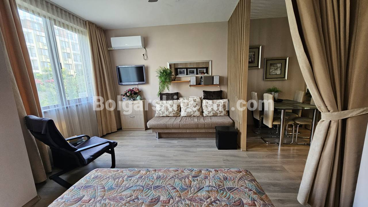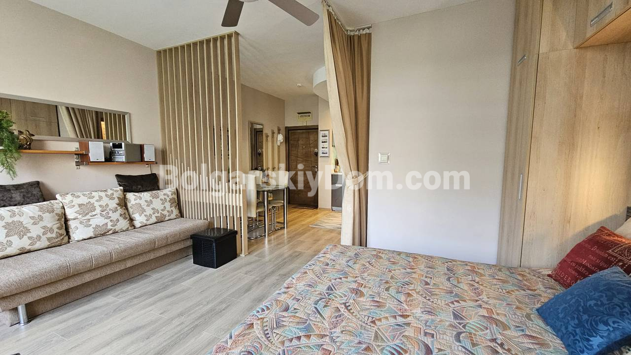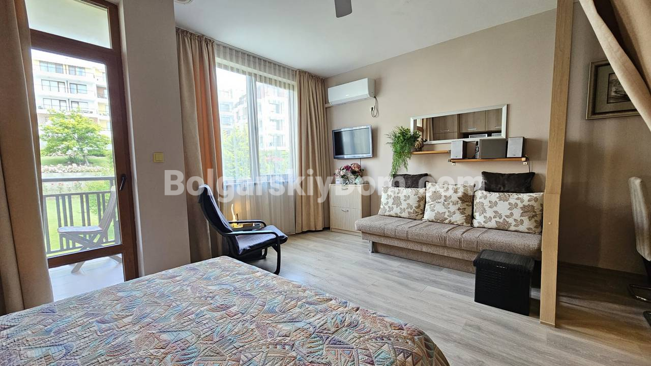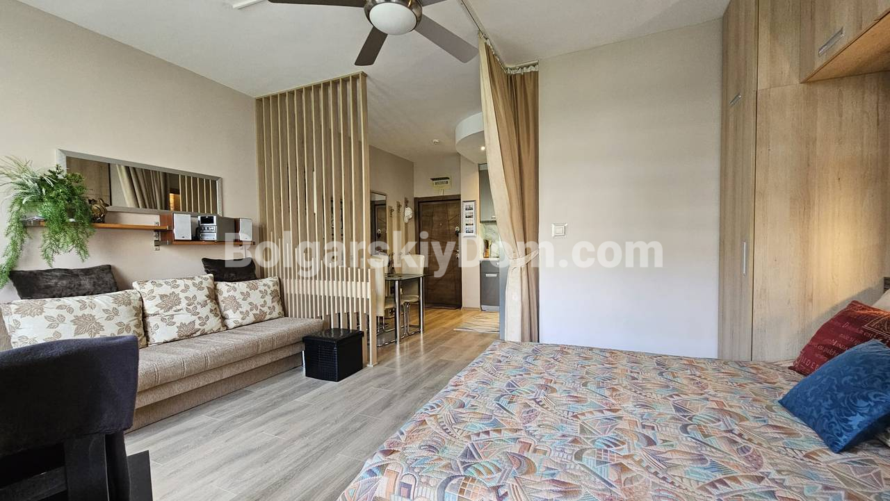 Топ-локация от Болгарского Дома и самый продаваемый формат, спешите! Уютная меблированная студия в комплексе Райский Сад, всего в 50 метрах от моря! Метраж 44,7 кв.м., 3 этаж, приятный вид на ухоженную территорию. Функциональная планировка: гостиная зона с кухней, место для сна, ванная с душем и балкон. Всё готово к проживанию или сдаче — установлен кондиционер, есть мебель и техника. Без лишних деталей и необходимости вложений, ждем вашего звонка!