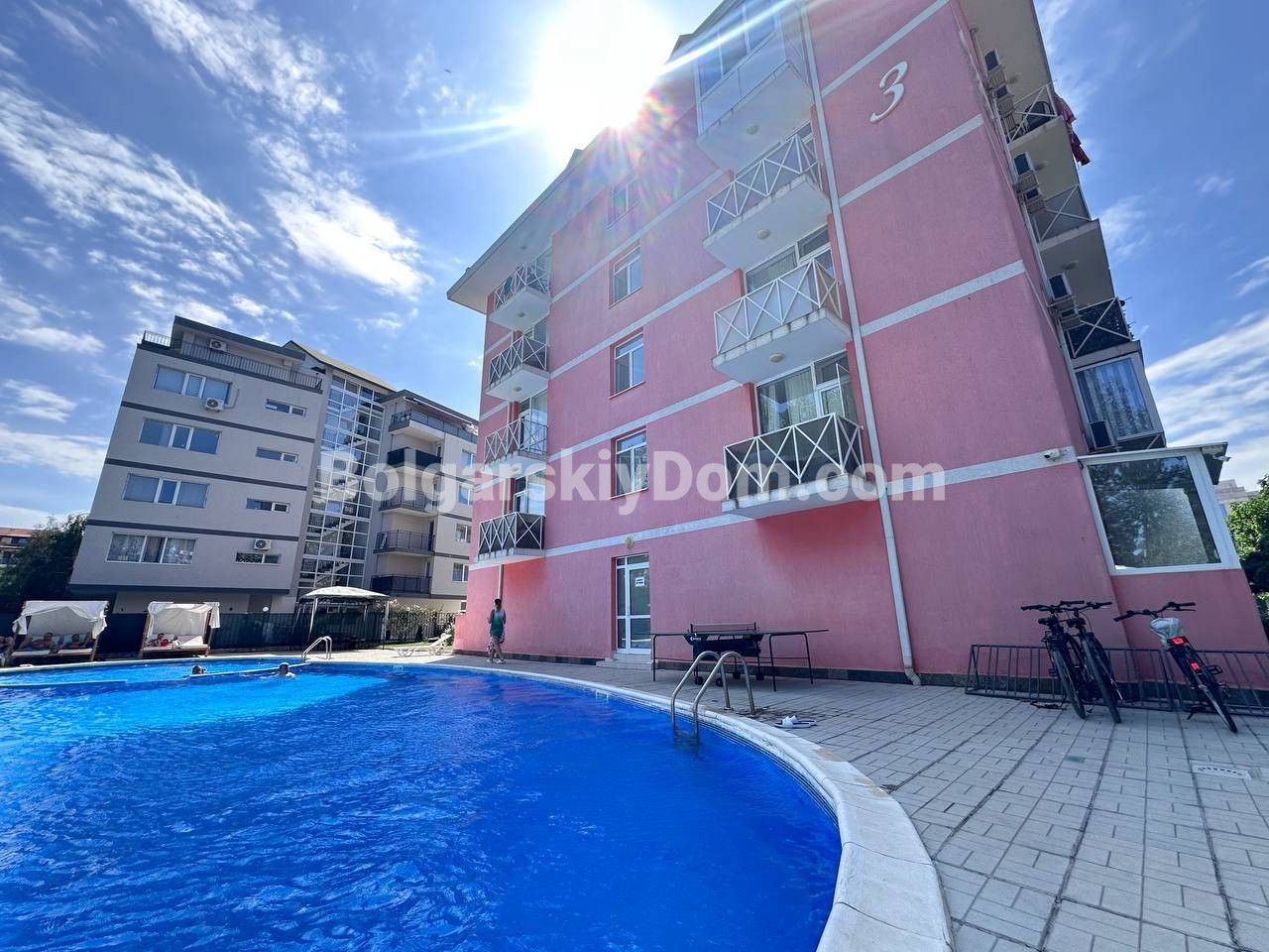Гербер 3 расположен в 700 метрах от пляжа, в спокойной части Солнечного Берега рядом с рекой. В пешей доступности ресторан Венеция с европейской кухней и супермаркет Жанет. В спектр удобств ЖК входят открытый бассейн с детской секцией, парковку, лифт и круглосуточная охрана, а такса 10 евро за кв.м в год покрывает обслуживание.