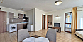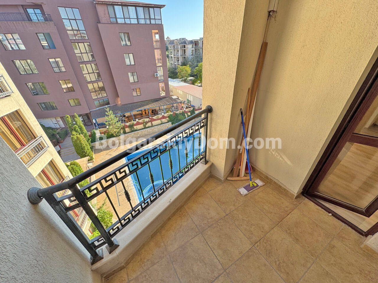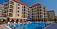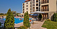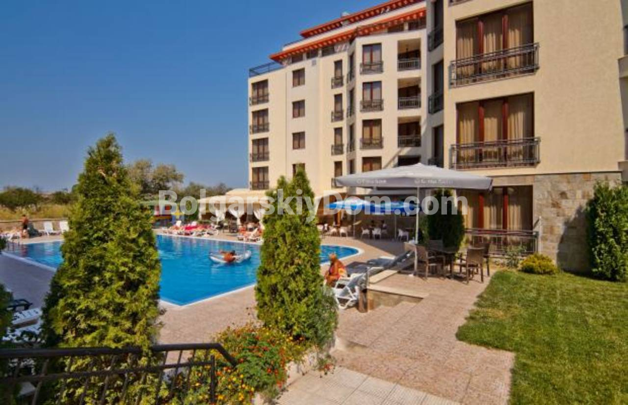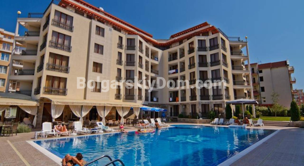 Комплекс Камелот Резиденс, в котором и расположена квартира, выполнен в современном средиземноморском стиле с болгарскими акцентами. Приятного цвета фасад, просторные балконы и панорамные окна создают ощущение свободы и близости к природе. На ухоженной территории расположены аккуратные аллеи, обустроена зона отдыха, есть бассейн с шезлонгами, детская площадка, ресторан и парковка. Все это делает его идеальным местом для жизни, а до моря всего 700 метров. Годовая такса поддержки составляет 10 евро за квадратный метр.