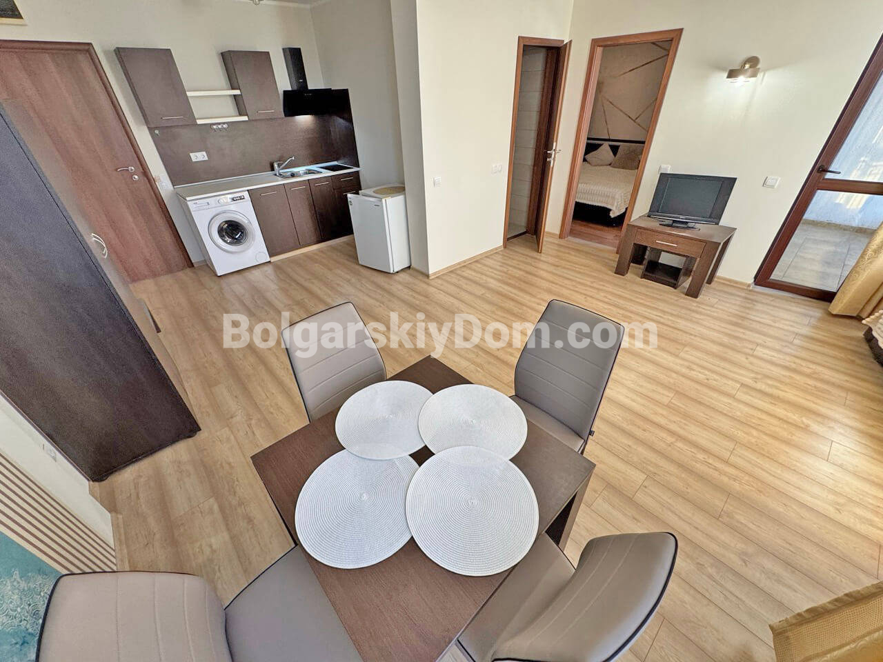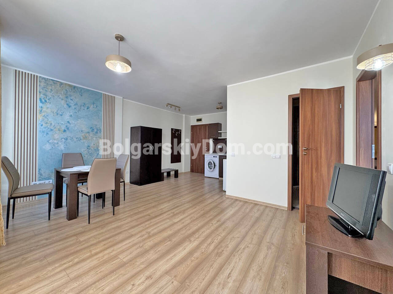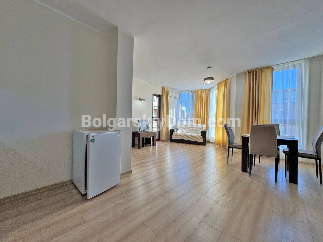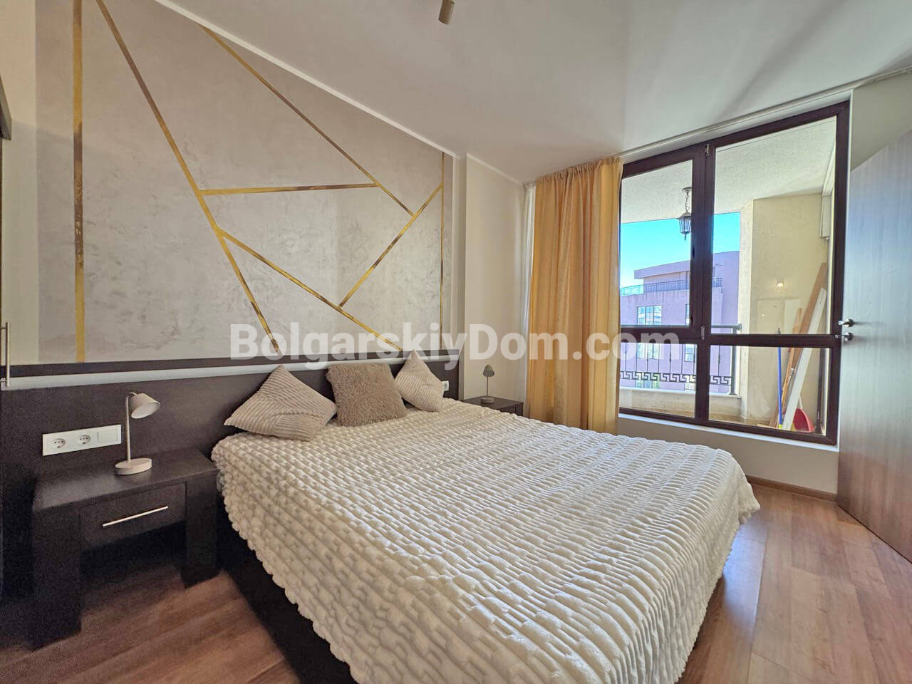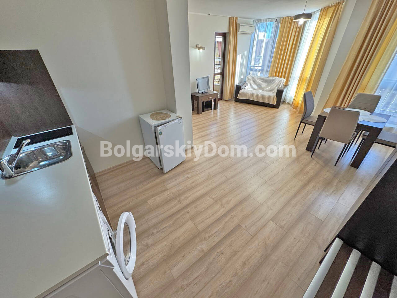 В самом сердце крупнейшего болгарского курорта, в тихой и зеленой части Солнечного Берега, мы предлагаем просторную двухкомнатную квартиру, уже оформленную под ключ, причем качественно. Этот светлый и просторный апартамент площадью 60 кв.м. расположен на пятом этаже и имеет приватный балкон. Его планировка включает прихожую, гостиную, которая имеет грамотное зонирование, спальню, ванную комнату и террасу. Компактная кухня органично вписана в пространство, что делает квартиру очень удобной для проживания.