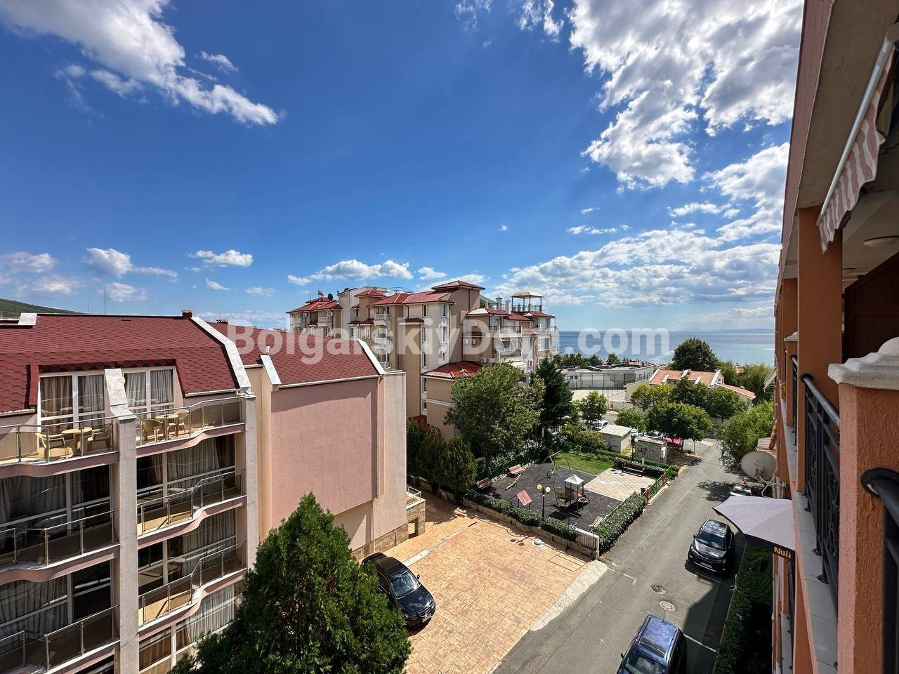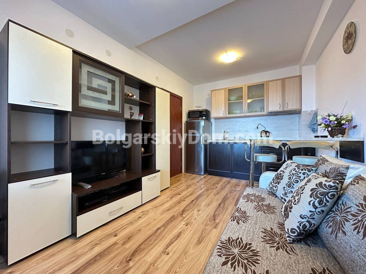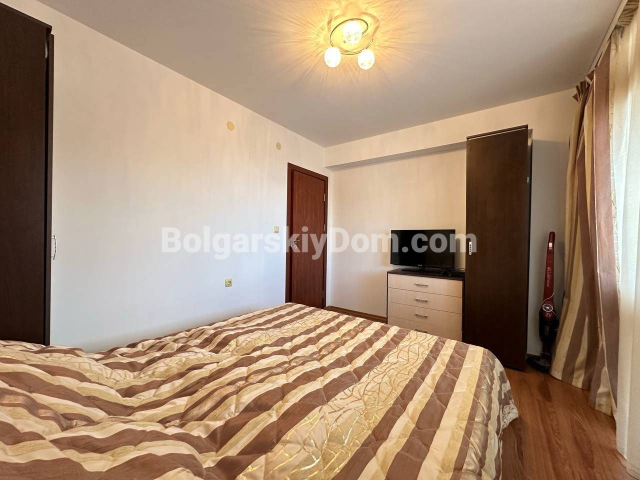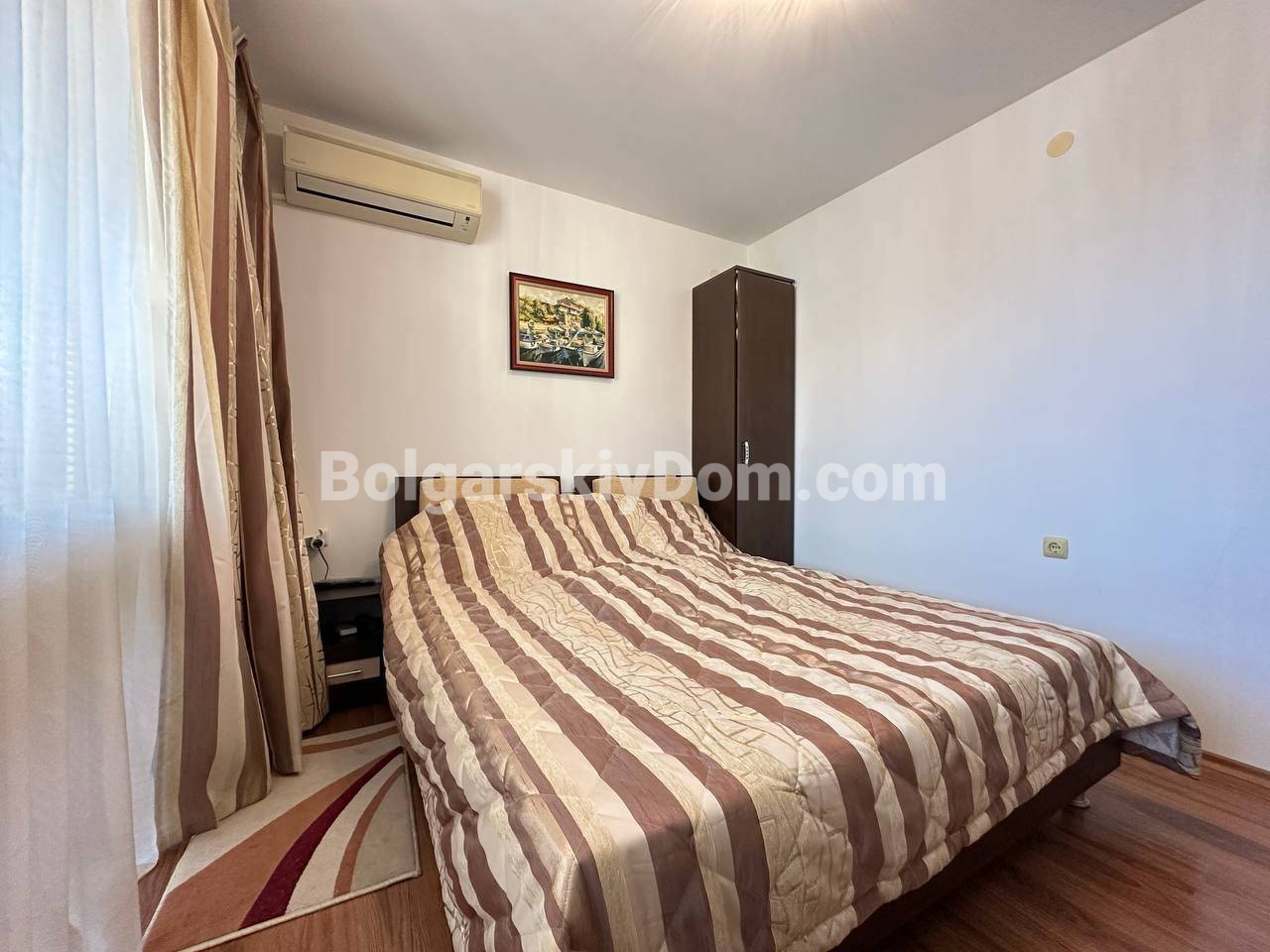 Смотрите, какая приятная двухкомнатная квартира появилась в продаже от АН "Болгарский дом"! Апартамент расположился на шестом (предпоследнем) этаже современного комплекса в Святом Власе — всего в нескольких минутах от моря. 50 кв. метров комфорта и уюта. Квартира полностью меблирована и оборудована техникой. Продуманная планировка: гостиная условно разделена на кухню и зону отдыха столом-барной стойкой. В спальне большая кровать и шкаф. Просторная терраса тянется вдоль обеих комнат, там есть небольшой уголок для чаепитий с садовой мебелью, и О, ДА! - боковой вид на море. Даже слышно шум волн.