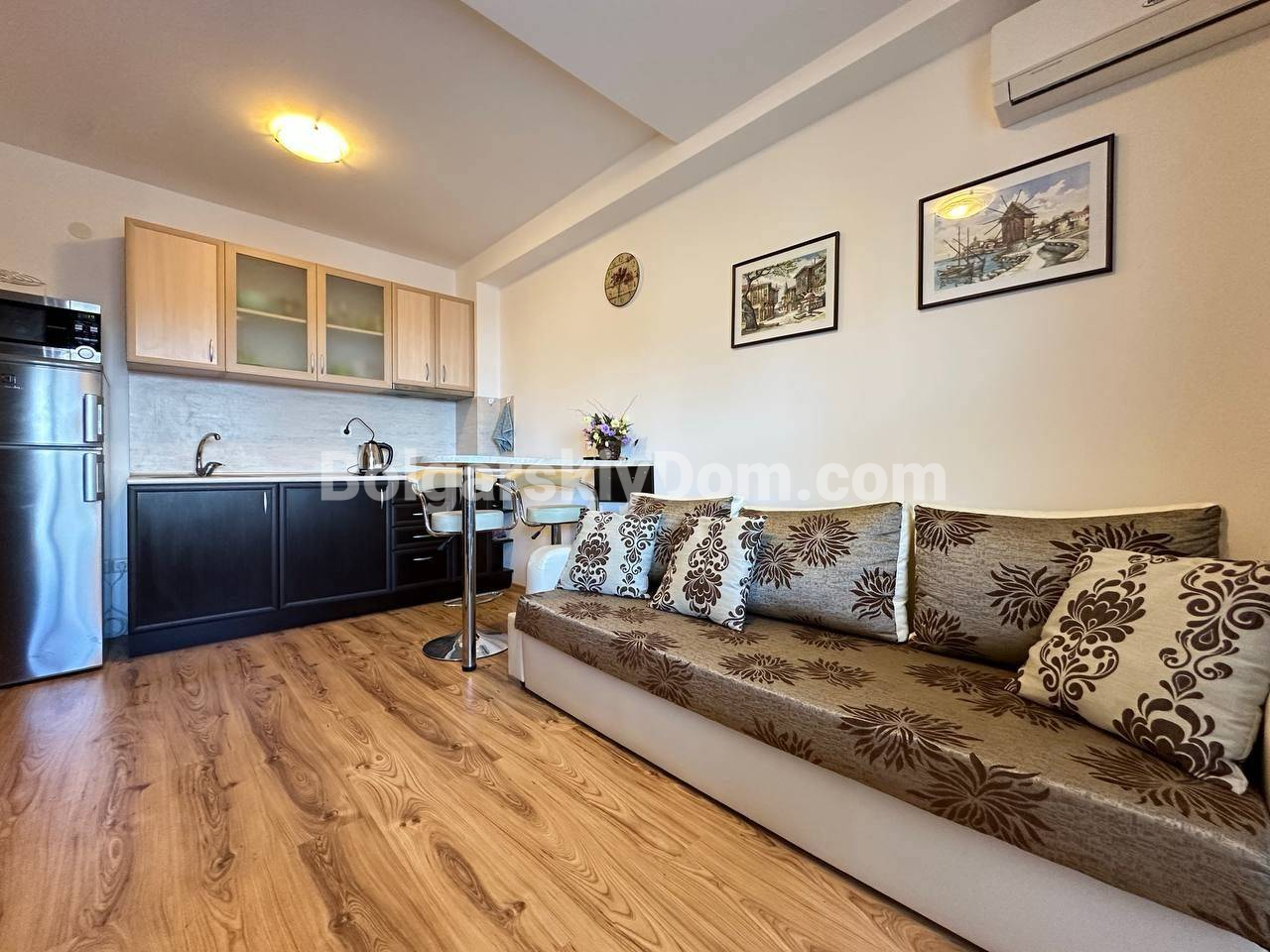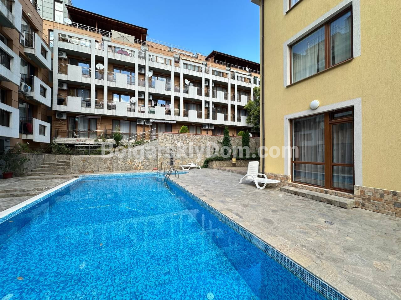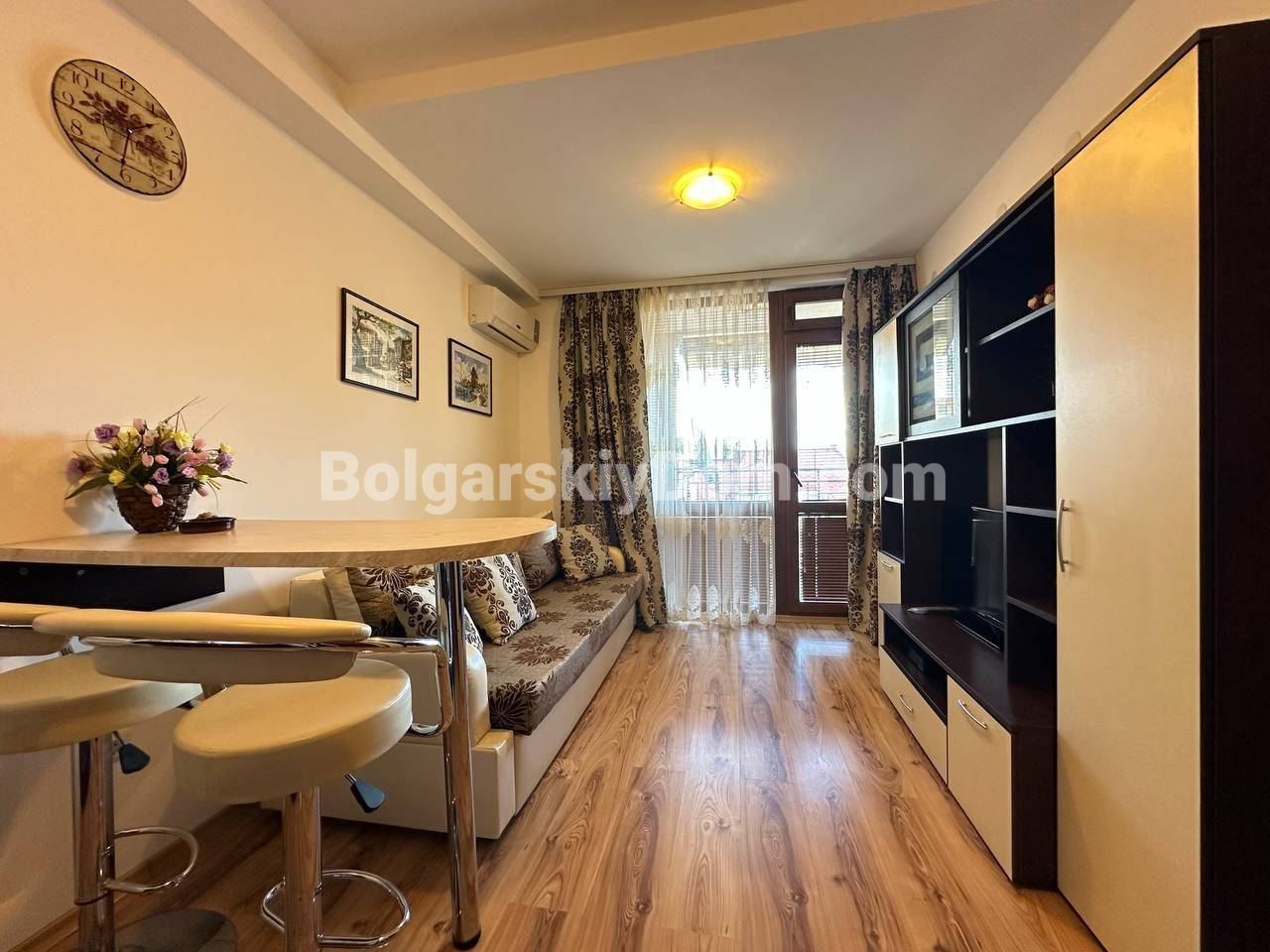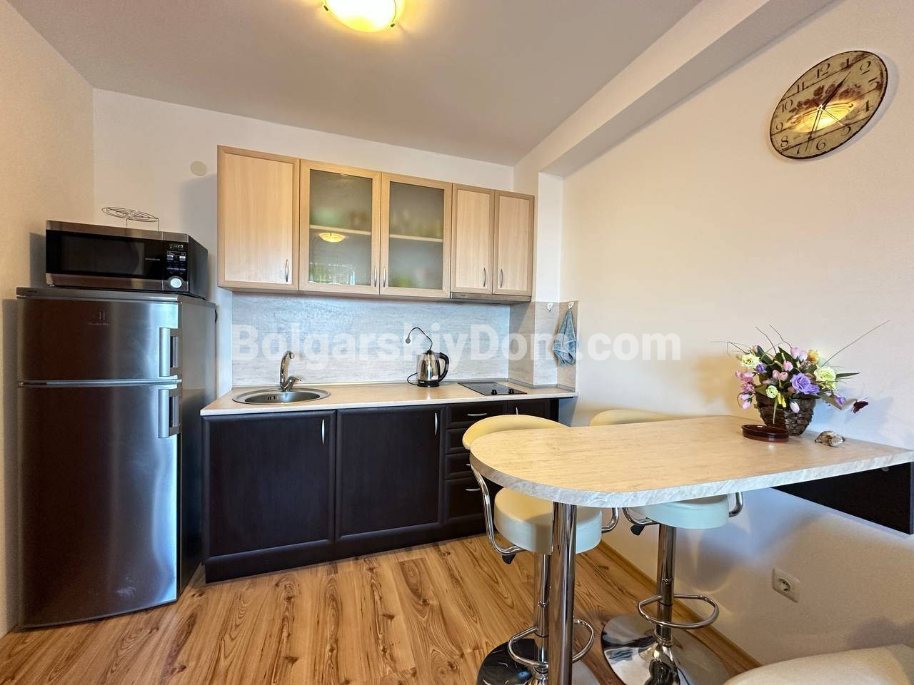 Смотрите, какая приятная двухкомнатная квартира появилась в продаже от АН "Болгарский дом"! Апартамент расположился на шестом (предпоследнем) этаже современного комплекса в Святом Власе — всего в нескольких минутах от моря. 50 кв. метров комфорта и уюта. Квартира полностью меблирована и оборудована техникой. Продуманная планировка: гостиная условно разделена на кухню и зону отдыха столом-барной стойкой. В спальне большая кровать и шкаф. Просторная терраса тянется вдоль обеих комнат, там есть небольшой уголок для чаепитий с садовой мебелью, и О, ДА! - боковой вид на море. Даже слышно шум волн.