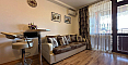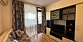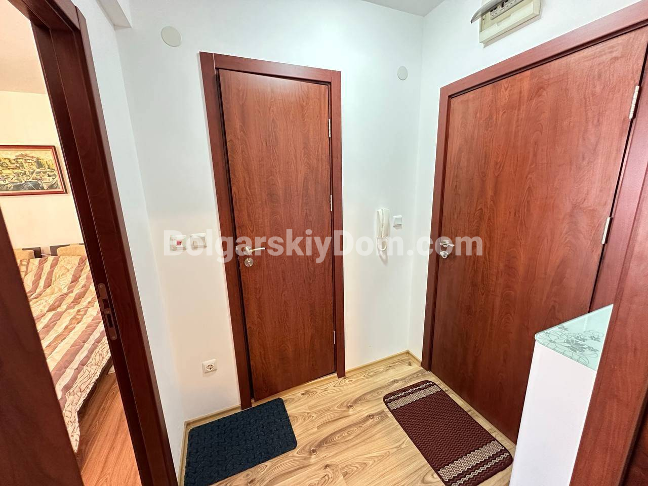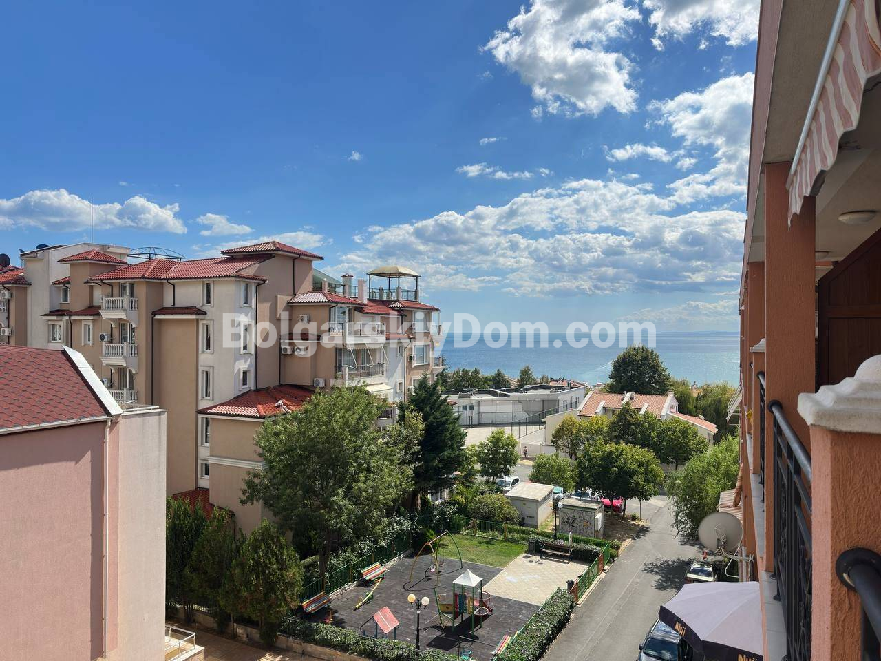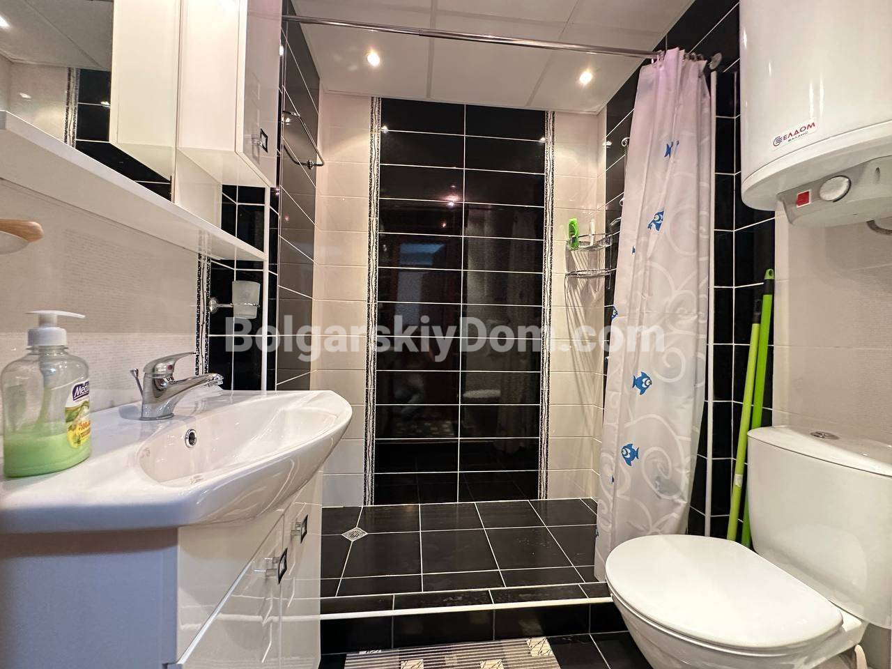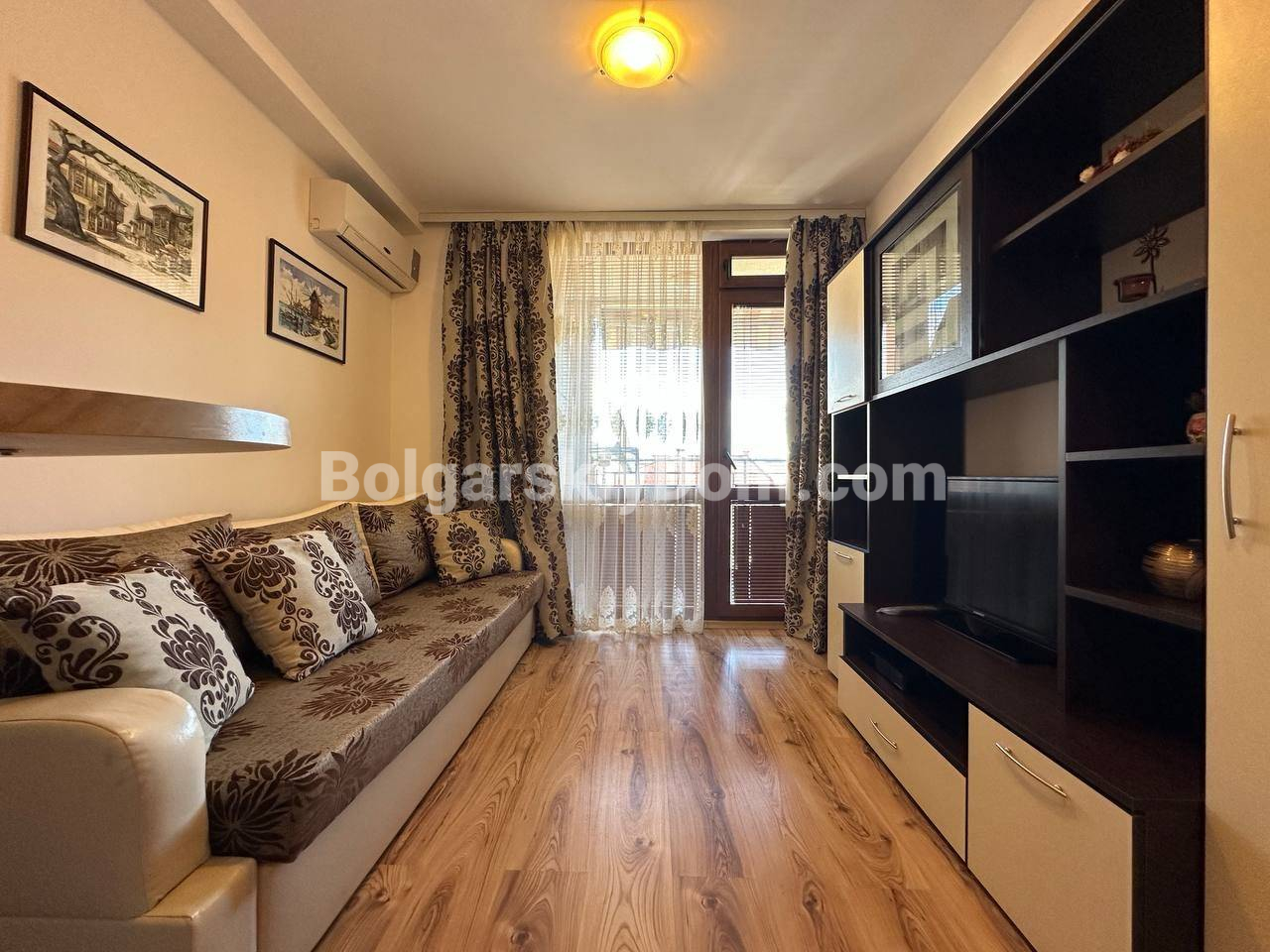 Смотрите, какая приятная двухкомнатная квартира появилась в продаже от АН "Болгарский дом"! Апартамент расположился на шестом (предпоследнем) этаже современного комплекса в Святом Власе — всего в нескольких минутах от моря. 50 кв. метров комфорта и уюта. Квартира полностью меблирована и оборудована техникой. Продуманная планировка: гостиная условно разделена на кухню и зону отдыха столом-барной стойкой. В спальне большая кровать и шкаф. Просторная терраса тянется вдоль обеих комнат, там есть небольшой уголок для чаепитий с садовой мебелью, и О, ДА! - боковой вид на море. Даже слышно шум волн.