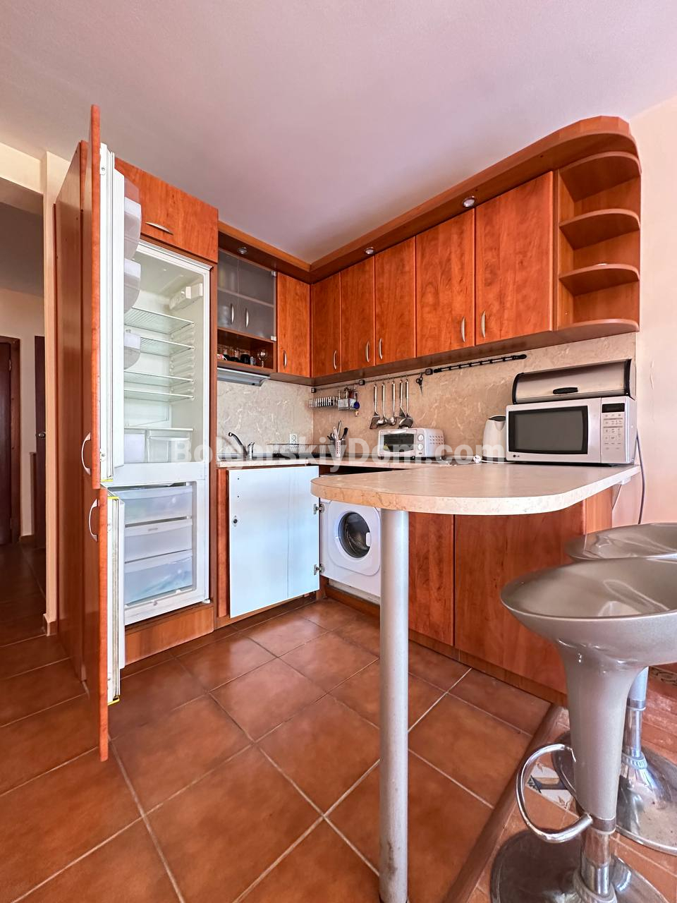 Каталог АН "Болгарский дом" пополнился новым предложением на Солнечном берегу. В этой двухкомнатной квартире всё устроено для спокойного и комфортного пребывания у моря. Апартамент площадью 88 кв.метров занимает третий этаж здания с лифтом и отличается оригинальной и продуманной планировкой: уютная прихожая, гостевой санузел, просторная гостиная с кухонной зоной и местом для отдыха, большая спальня с собственной ванной комнатой и проходной гардеробной, а также широкий балкон с видом на зелёный двор и бассейн.