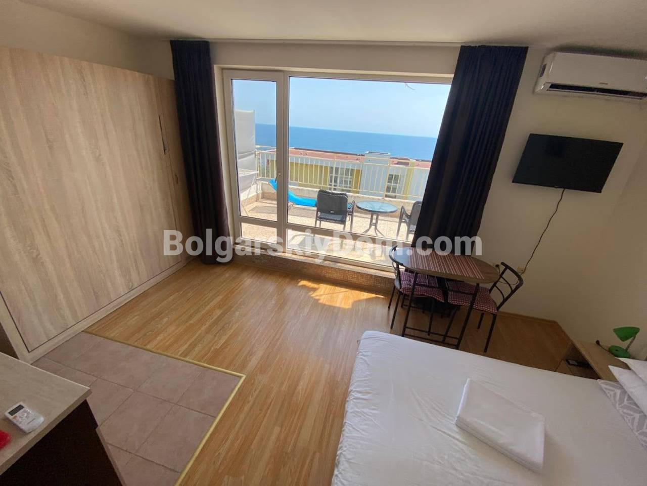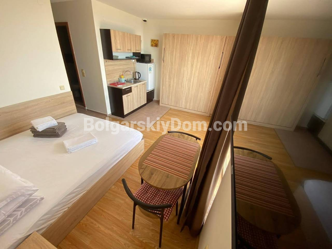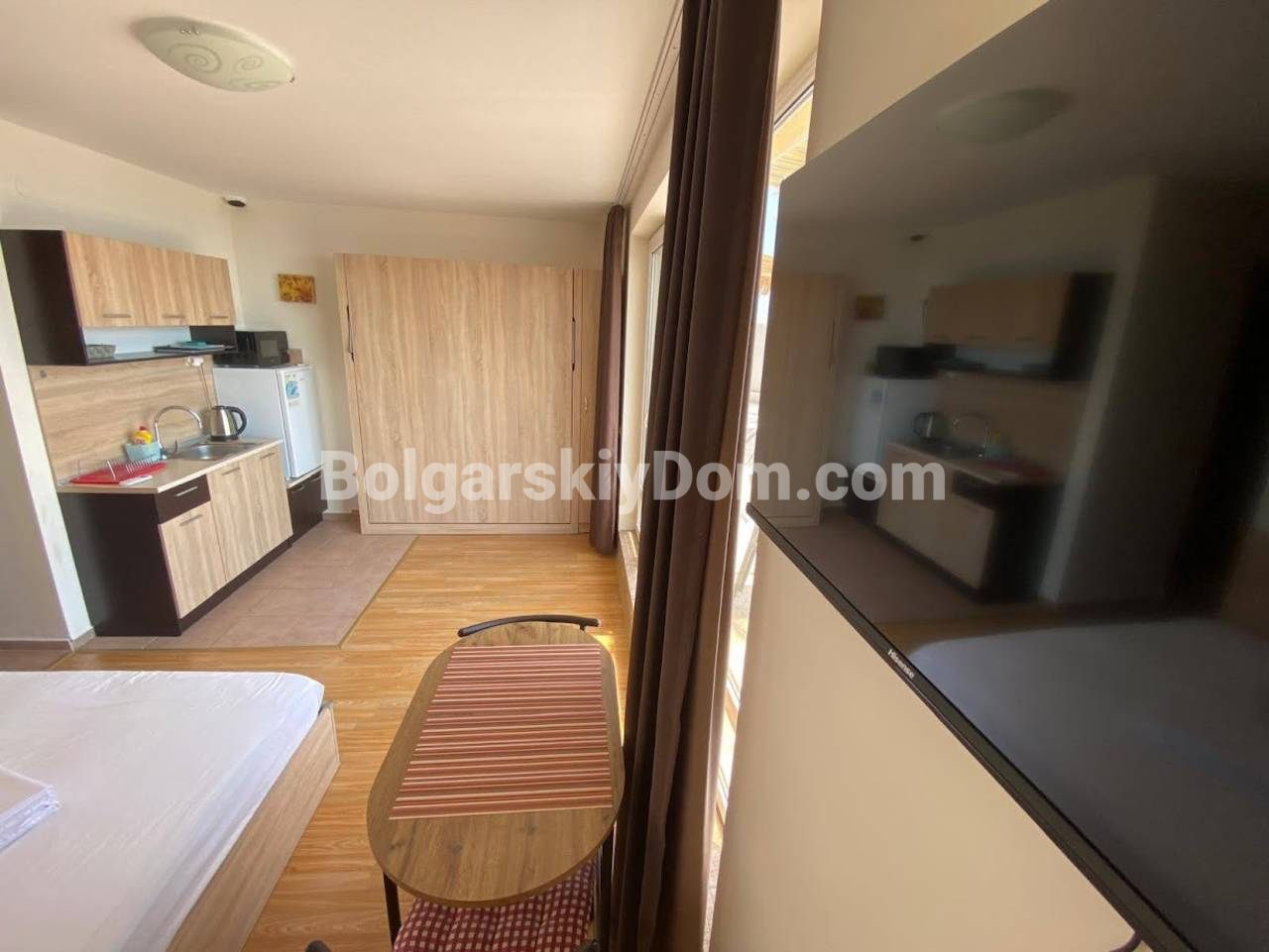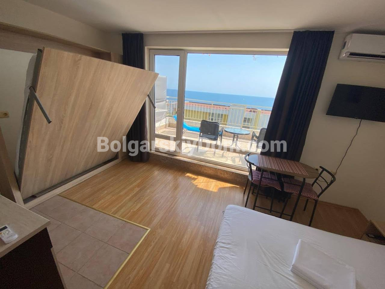Внимание-внимание! АН Болгарский Дом предлагает вам не просто квартиру, а абонемент в самый масштабный курортный комплекс Святого Власа! Это студия в Краун Форт Клуб - части грандиозного Форт Нокс Гранд Резорт - с потрясающим панорамным видом на море.Апартамент квадратурой 41 кв.м. расположен на шестом этаже и полностью готов к вашему приезду. Жизненное пространство продумано до самых мелких деталей: есть комфортная зона с двуспальной кроватью и обеденным столиком, компактная кухня в светлых тонах, оборудованная всем необходимым (холодильник, микроволновка), а также просторный санузел. Главный хит - это большая терраса с прямым видом на море, где уже стоят удобные кресла и шезлонг. Установлен кондиционер и вместительный шкафной блок для хранения.