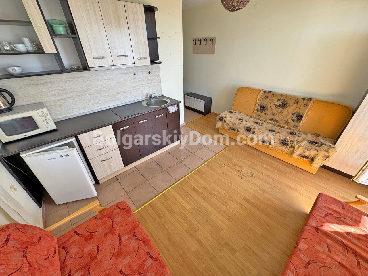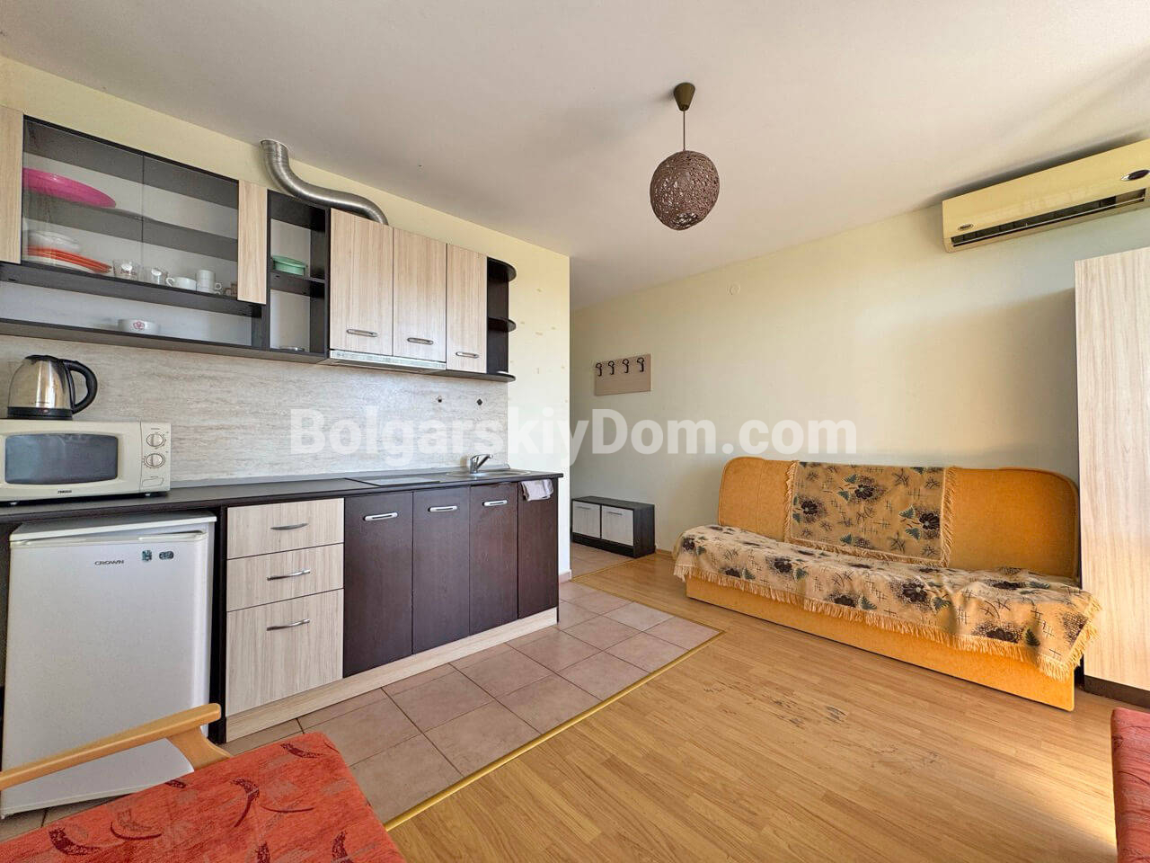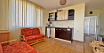 В западной части Солнечного берега появилось интересное предложение - светлая квартира-студия площадью 42 кв.метра. Расположена на 4 этаже одного из корпусов большого красивого комплекса из семейства Гранд Резорт. Это просторная комната с двумя диванами, кондиционером и компактной кухней; есть современный санузел с душевой кабиной, стиральной машинкой и бойлером, а также просторный балкон с приятным видом на зелёные насаждения и территорию. В апартаменте два больших окна, дающие много света, что делает ее очень уютной и комфортной.