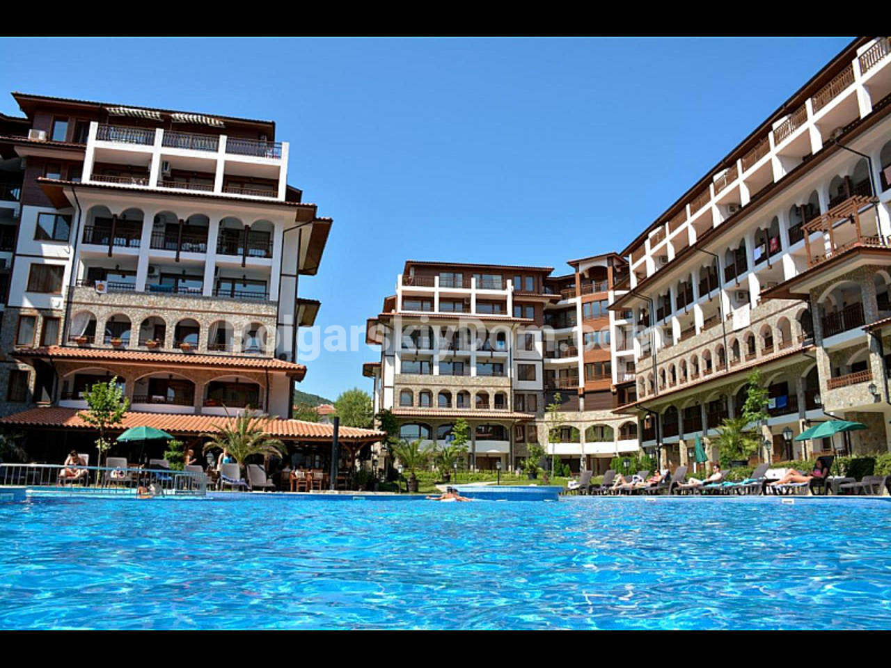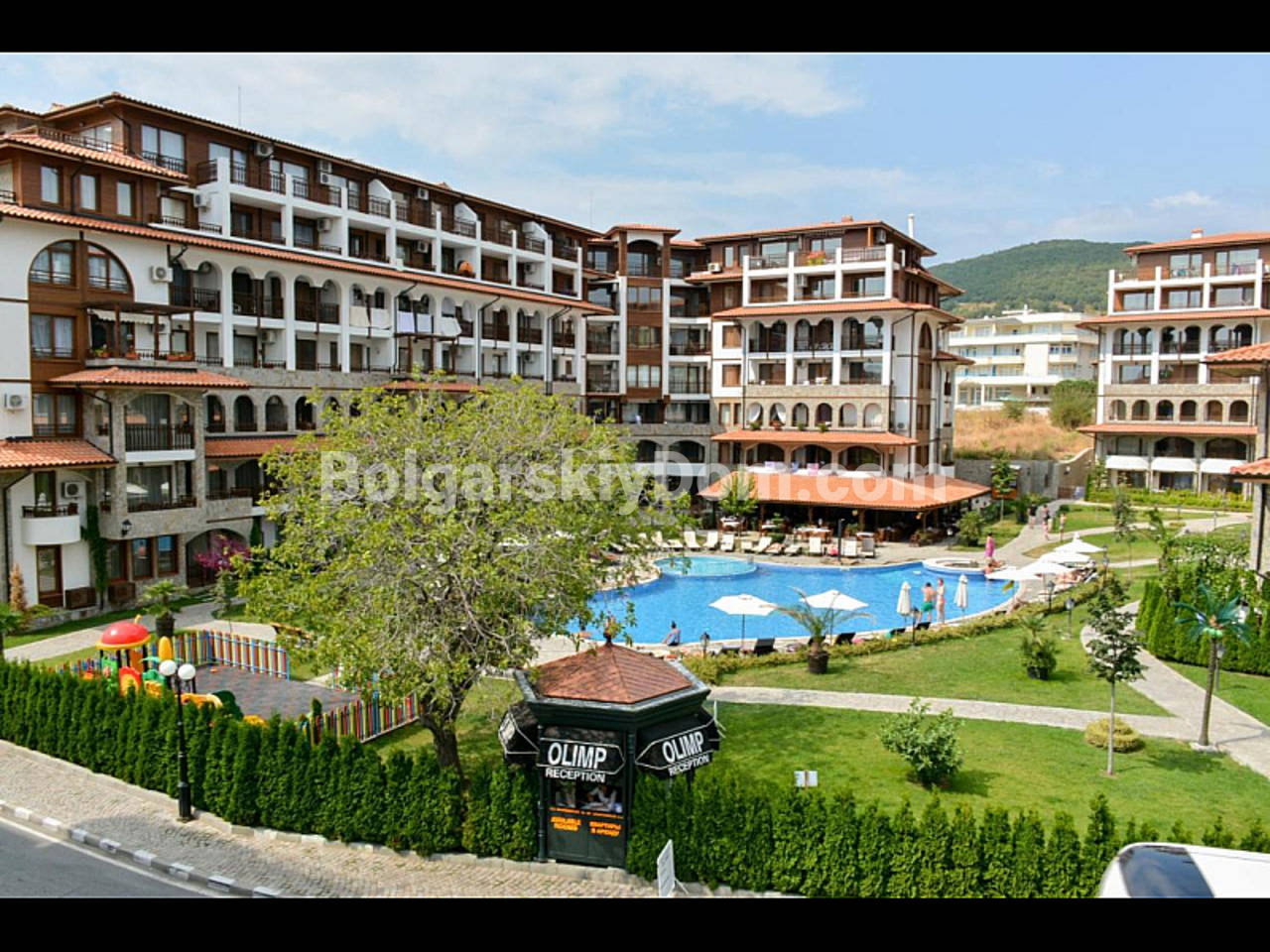 Комплекс Олимп полностью оправдывает свое название, находясь в самой престижной части Святого Власа. До песчаных пляжей и чистого моря всего 300 метров - это расстояние короткой и приятной прогулки. Инфраструктура комплекса создана для жизни класса люкс: на красиво озелененной территории есть роскошный ресторан, прекрасный открытый бассейн с зонами отдыха, сауна и джакузи, а также детская площадка. Вся необходимая городская инфраструктура (супермаркет, банкомат, прокат авто) находится прямо рядом с домом. При таком высоком уровне сервиса и фешенебельной локации годовая такса обслуживания составляет невероятно скромные 8 евро за квадратный метр.