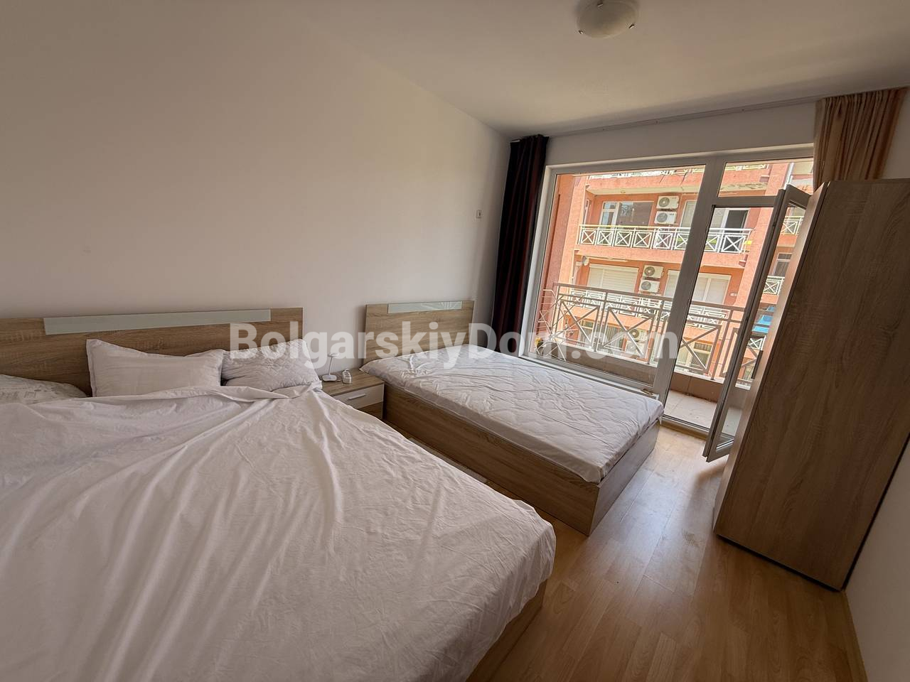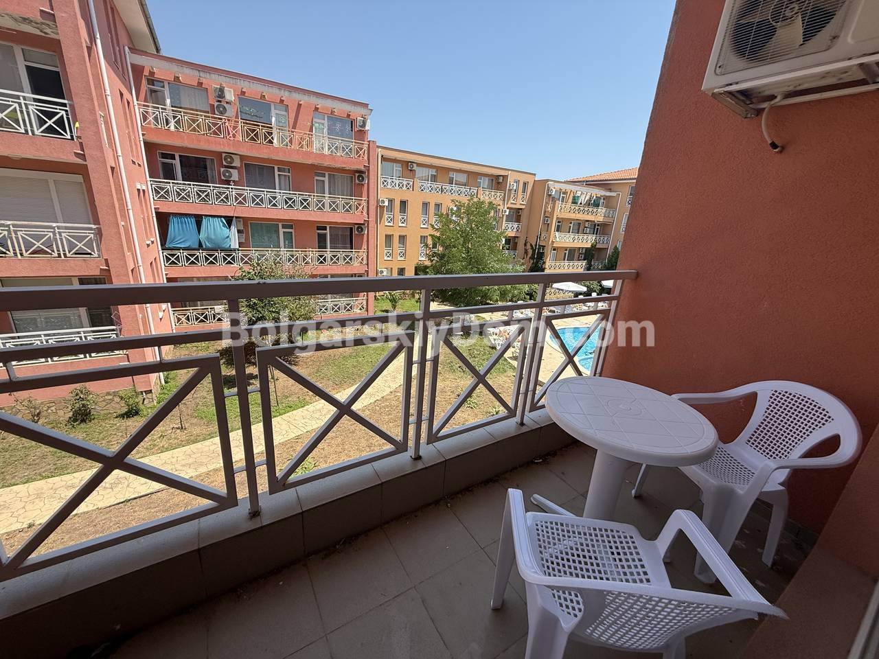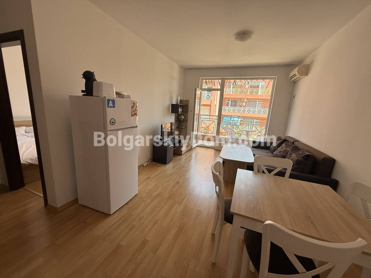 Мечтаете о собственном уголке у моря в доступном бюджете? Эта меблированная двухкомнатная квартира площадью 57 кв.метров в пригороде ТОП-курорта Солнечный берег — готовое решение для отдыха, жизни или аренды с потрясающим ценником - менее 1000 евро за кв.метр. Расположена на втором этаже четырёхэтажного здания — без лифта, но с легкостью и тишиной загородного уюта. Внутри всё продумано для вашего комфорта: светлая гостиная с кухонным уголком, зоной отдыха и обеденным столом. Уютная спальня с двумя кроватями и шкафом. Ванная комната с душем. И, конечно, просторная терраса с видом на бассейн — идеальное место для утреннего кофе или вечернего бокала вина.