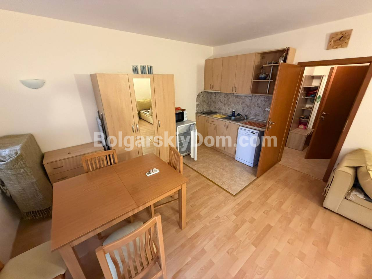Комплекс, в котором расположена квартира, находится в одном из самых востребованных районов курорта Солнечный Берег и имеет закрытую, ухоженную территорию и собственный бассейн для отдыха. Ключевое преимущество локации - пешая доступность ко всей необходимой инфраструктуре и морю: всего 50 метров до пляжной линии, и не более десяти минут спокойной ходьбы до золотого песка. В непосредственной близости находится знаменитый супермаркет «Младост», обеспечивающий широкий выбор продуктов по демократичным ценам, что особенно ценно для постоянного проживания. Низкая такса обслуживания, составляющая всего 270 € в год, является одним из самых весомых аргументов в пользу этого предложения, делая его идеальным не только для отдыха, но и для круглогодичной жизни с минимальными ежегодными расходами.
