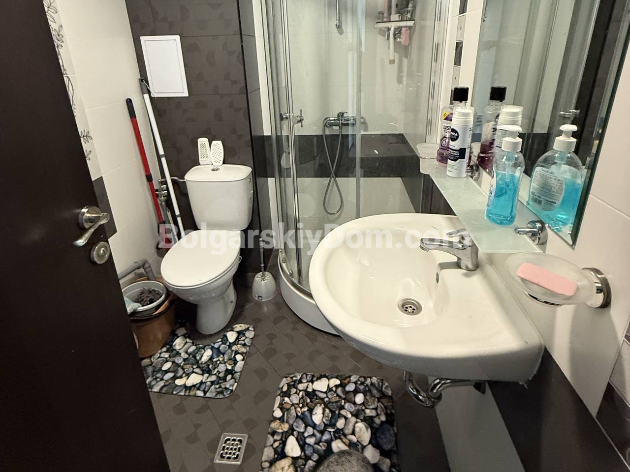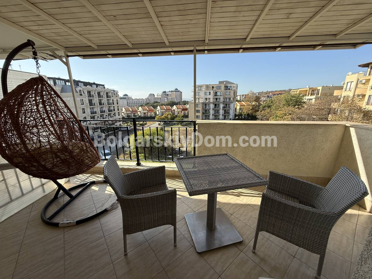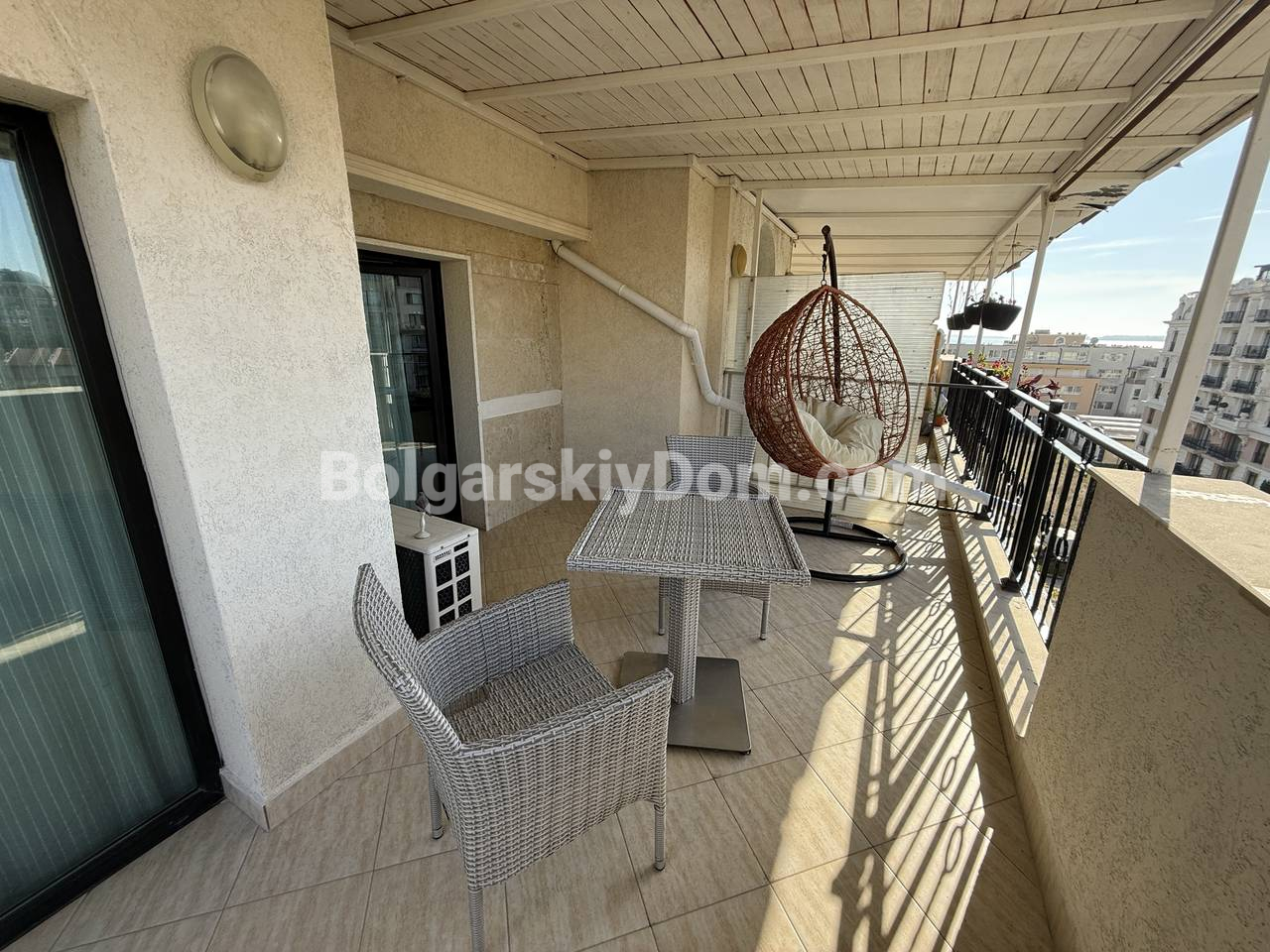Новинка, и это лучшее предложение по цене и благоустройству в Святом Власе – солнечная двухкомнатная квартира в комплексе Саут Бэй, которая продается с классно спланированным интерьером! Этот просторный апартамент площадью 76 кв.м. находится на 5 этаже в современном здании с лифтом. Квартира полностью меблирована, а интерьер выполнен с большим вкусом и функциональностью, то есть вам не нужно тратить время и силы на обустройство. Здесь очень много света благодаря большим окнам и приятным полуарочным формам, которые придают пространству особый шарм. И, конечно, есть организованная терраса, идеально подходящая для отдыха (с маркизой, закрытого типа).