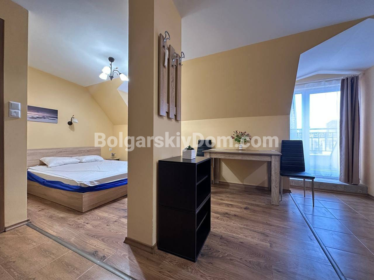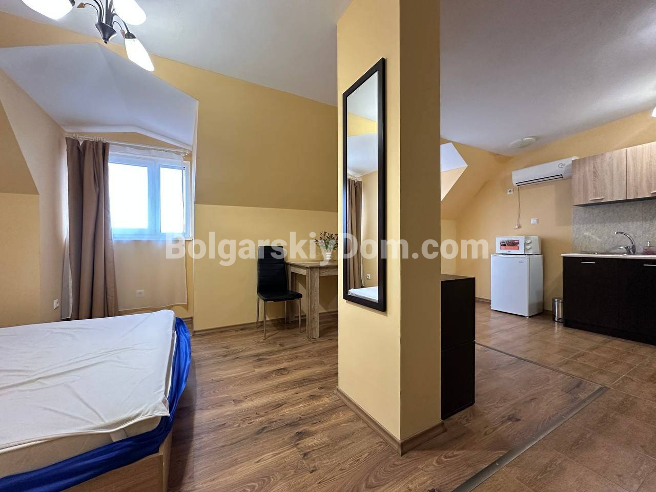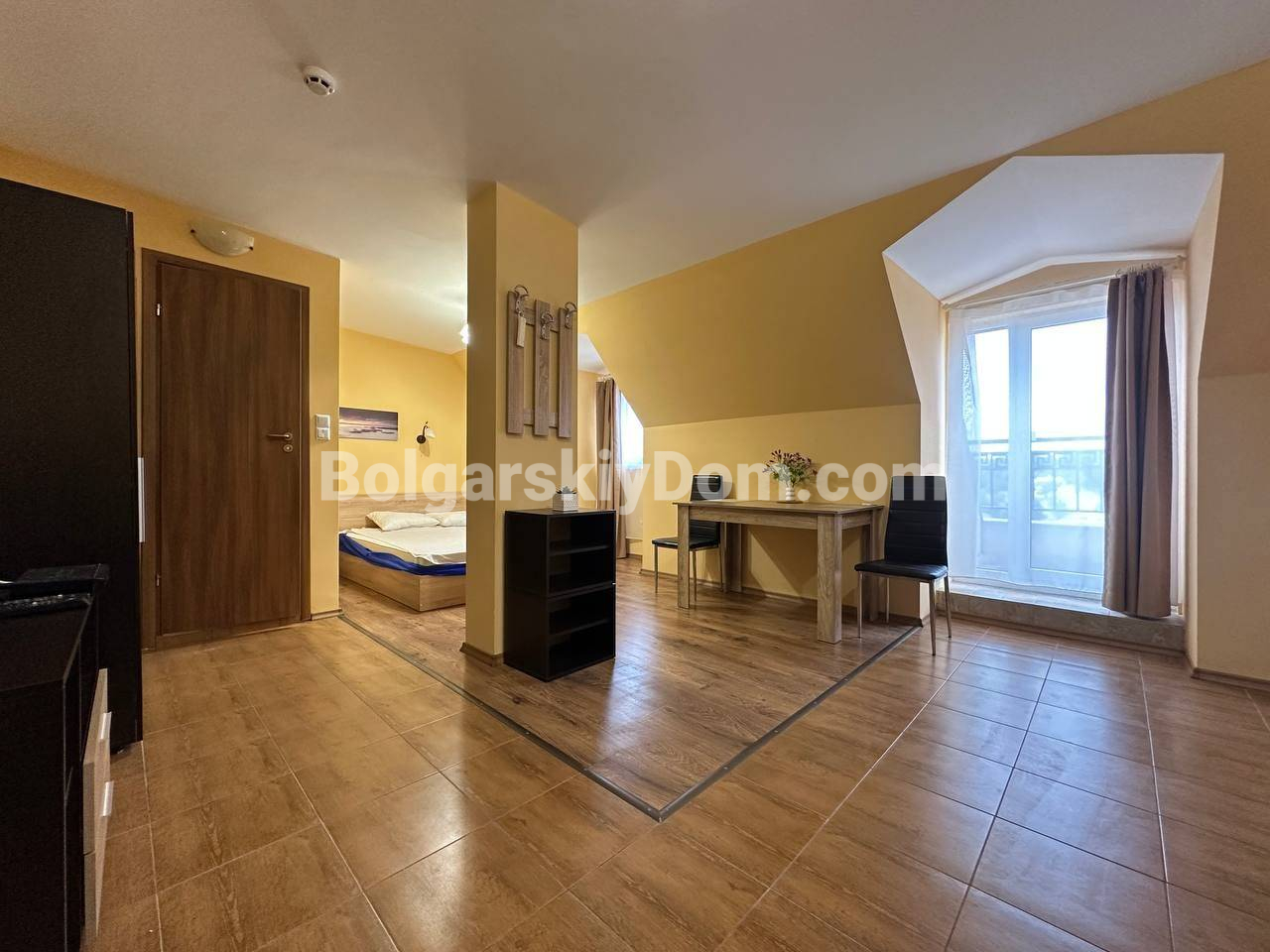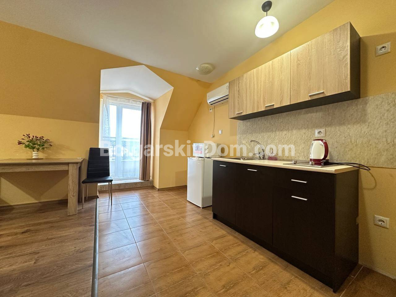 Свет, воздух и вид на море — студия со своим индивидуальным характером в комплексе Горизонт, расположенном в тихом зеленом районе на стыке курортов Солнечный берег и Святой Влас. Эта квартира на последнем, пятом этаже комплекса — не просто квадратные метры, а пространство с настроением. Площадь 40 кв. м продумана до мелочей: интересная круговая планировка создаёт ощущение движения и лёгкости. Справа — аккуратная кухонная зона, где всё под рукой. Слева, в уютной нише за колонной, спрятано спальное место — личный уголок уединения. Между ними — обеденная зона, которая объединяет всё пространство, делая его по-настоящему домашним. А за стеклянной дверью — небольшая терраса с видом, от которого трудно оторваться: бескрайний курорт и море на горизонте.