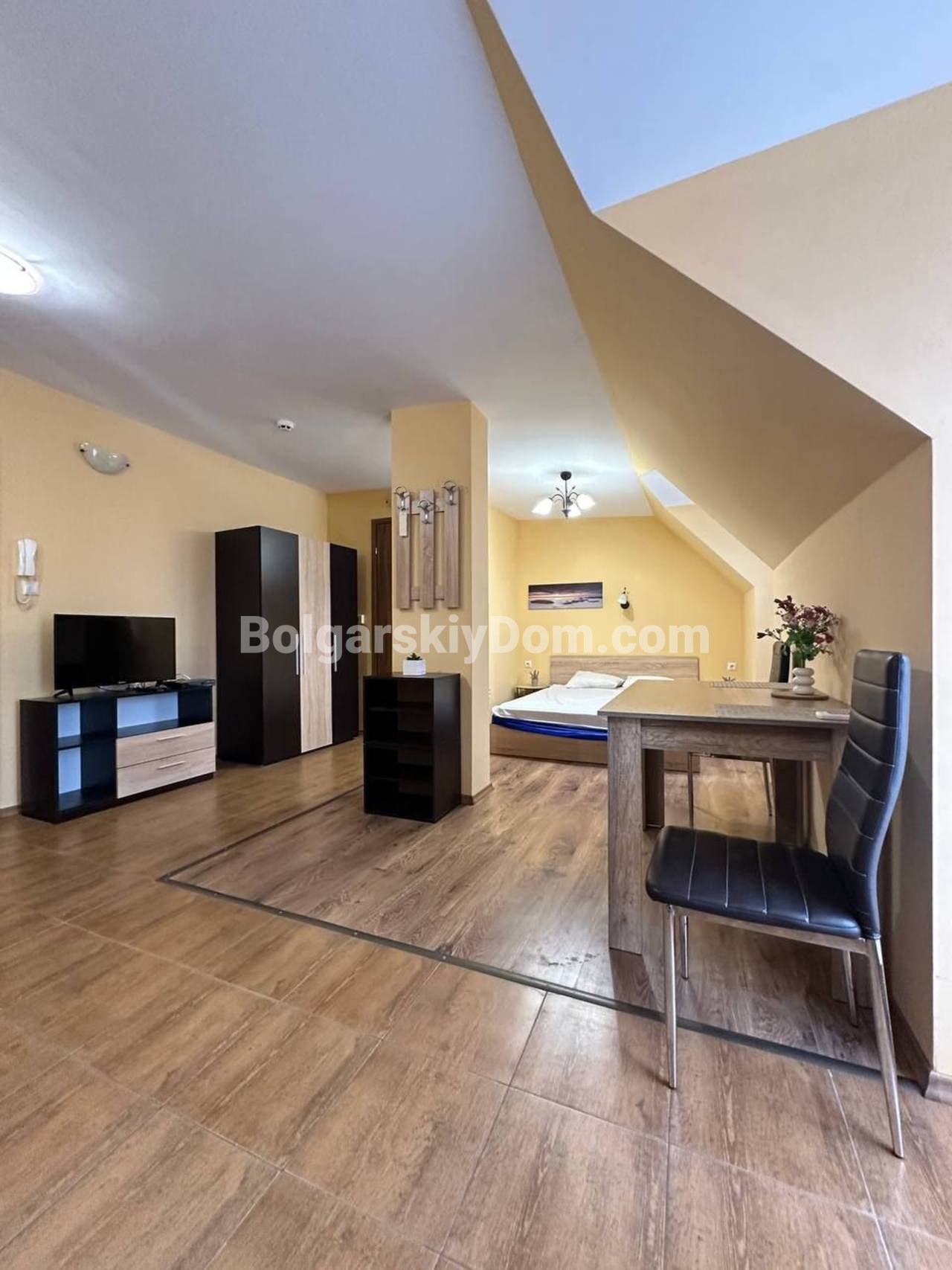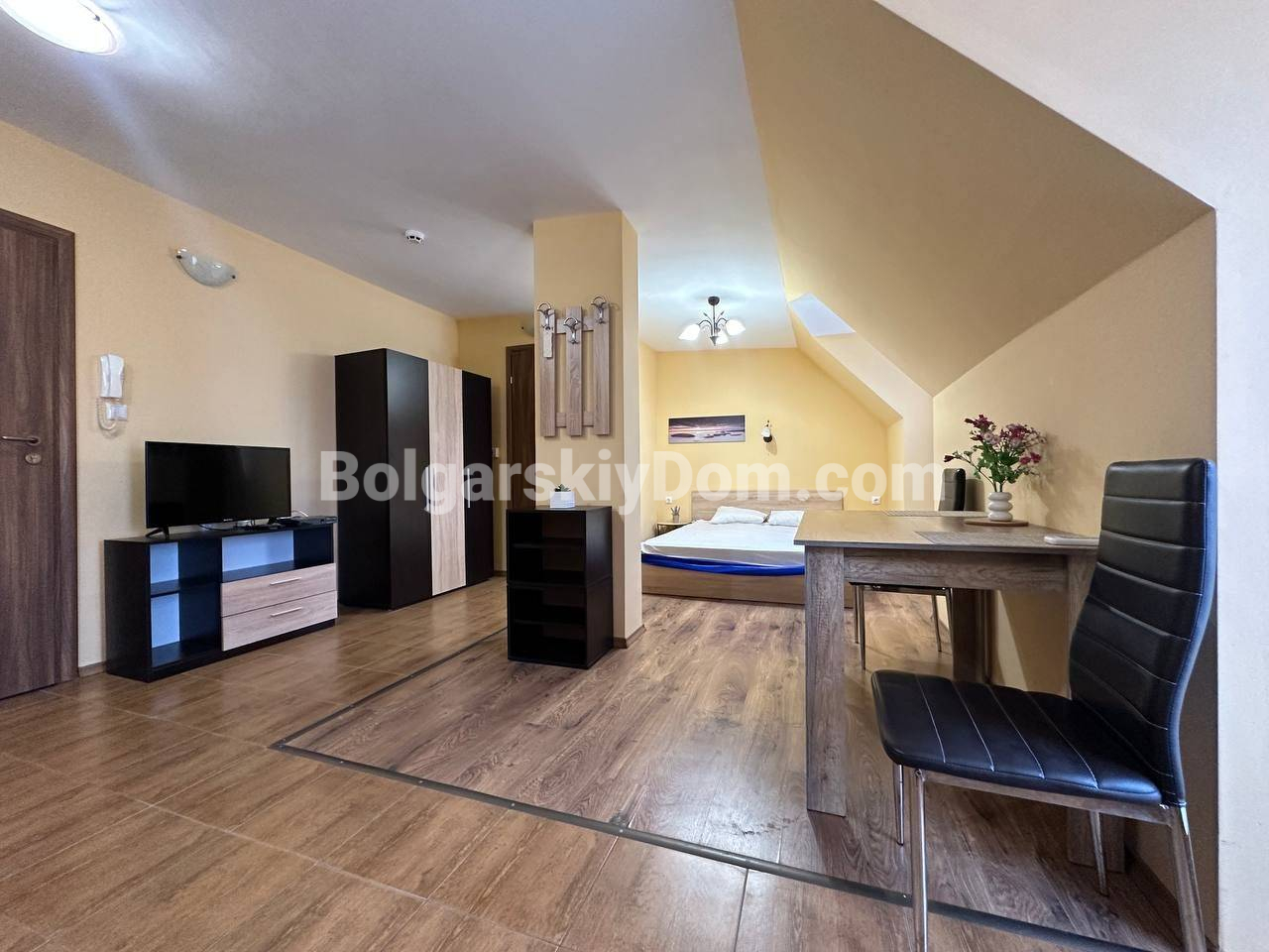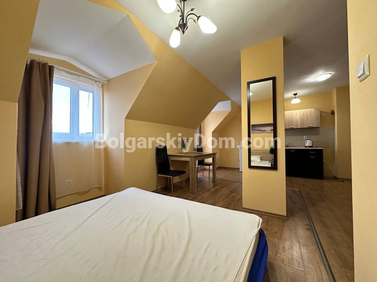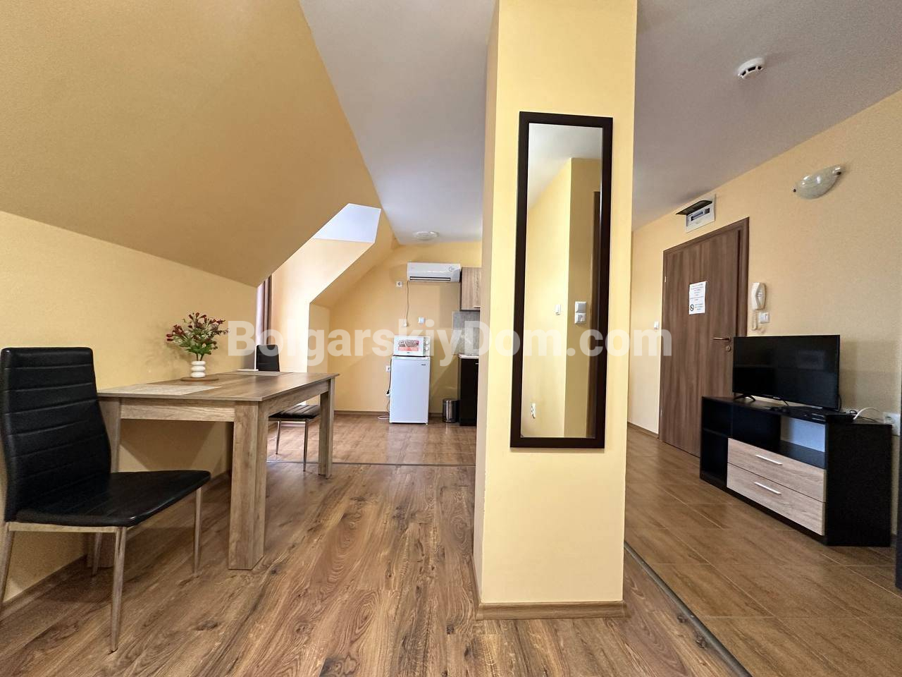 Свет, воздух и вид на море — студия со своим индивидуальным характером в комплексе Горизонт, расположенном в тихом зеленом районе на стыке курортов Солнечный берег и Святой Влас. Эта квартира на последнем, пятом этаже комплекса — не просто квадратные метры, а пространство с настроением. Площадь 40 кв. м продумана до мелочей: интересная круговая планировка создаёт ощущение движения и лёгкости. Справа — аккуратная кухонная зона, где всё под рукой. Слева, в уютной нише за колонной, спрятано спальное место — личный уголок уединения. Между ними — обеденная зона, которая объединяет всё пространство, делая его по-настоящему домашним. А за стеклянной дверью — небольшая терраса с видом, от которого трудно оторваться: бескрайний курорт и море на горизонте.
