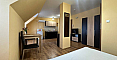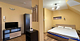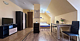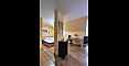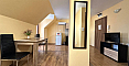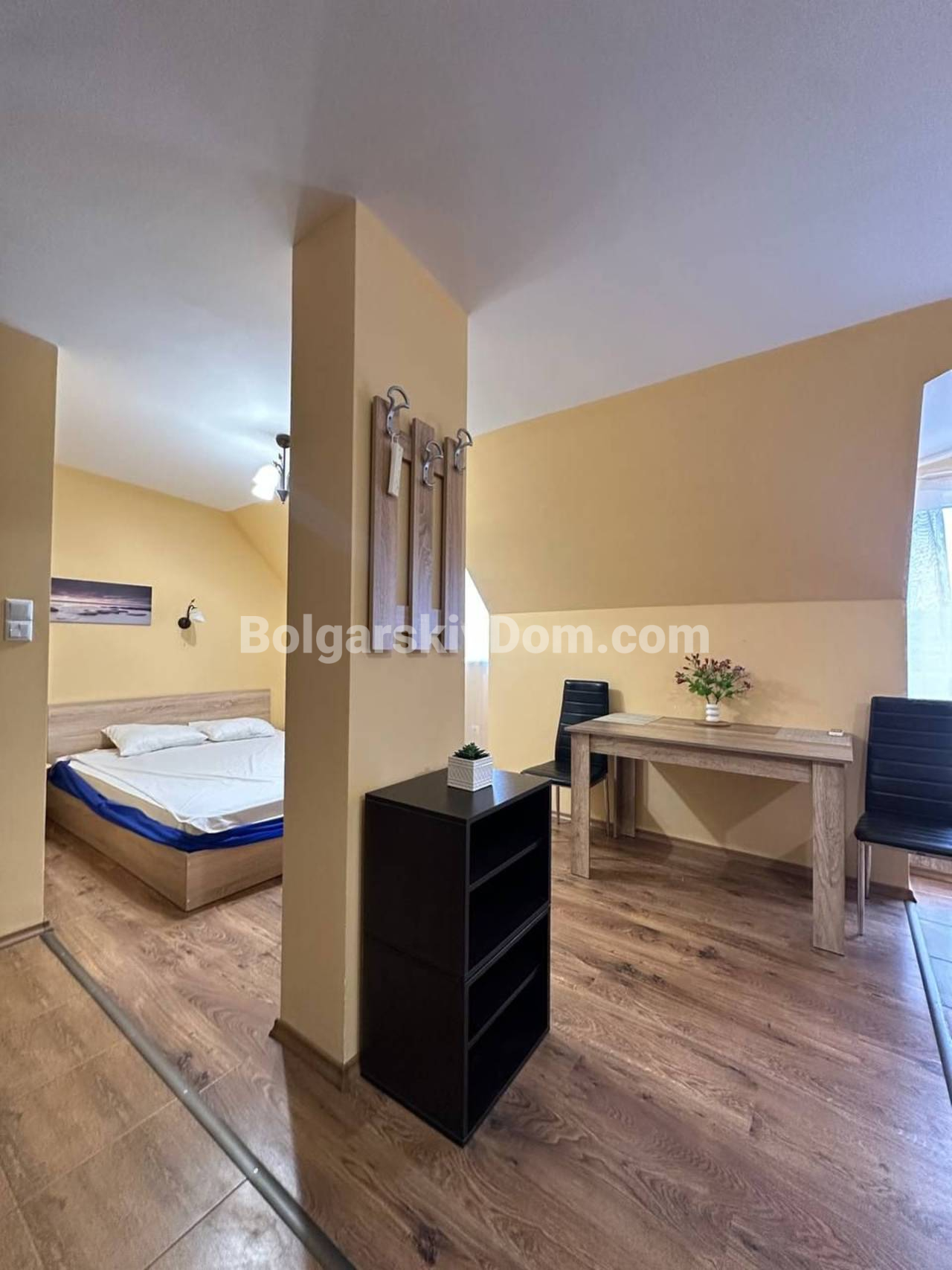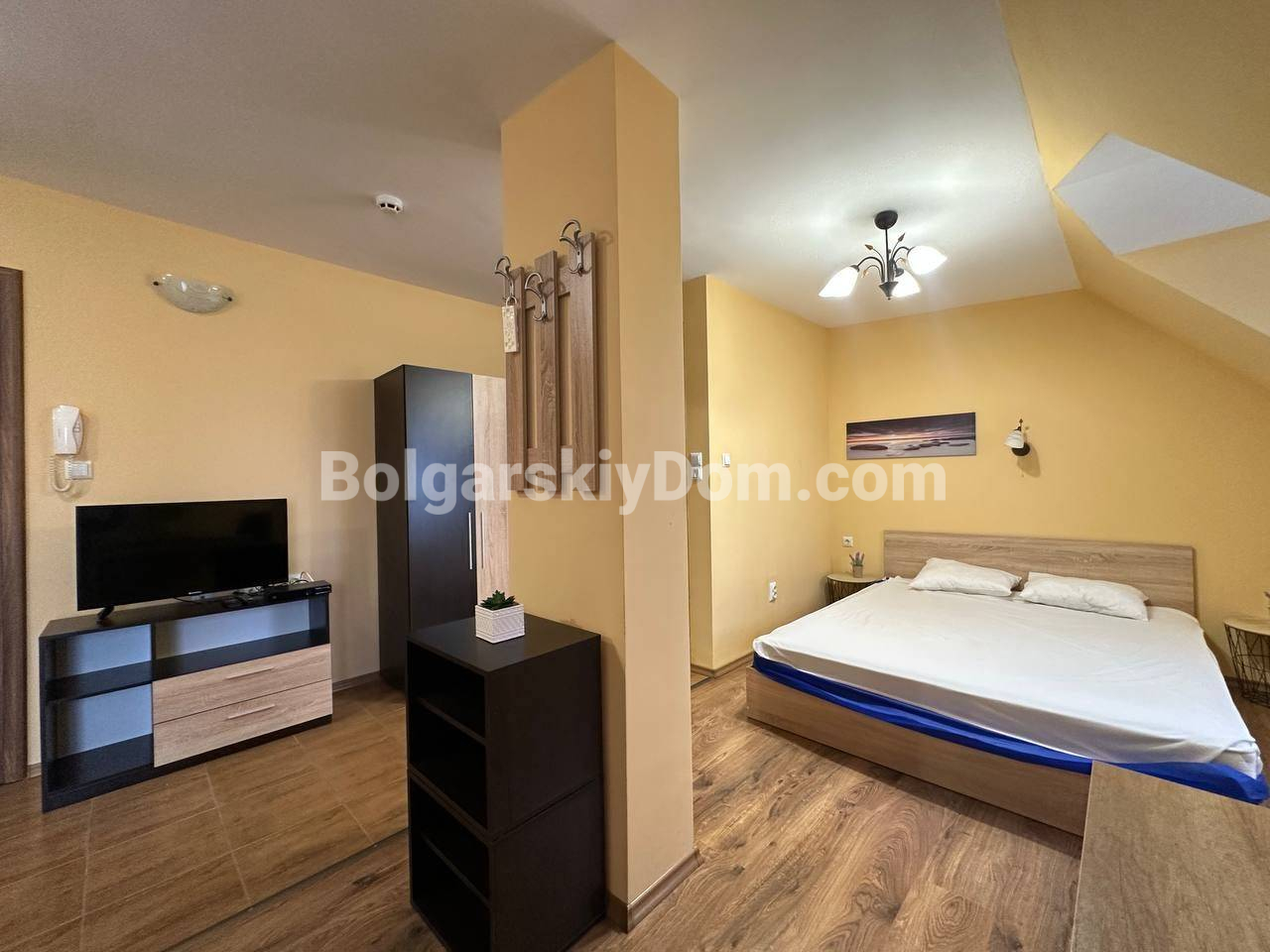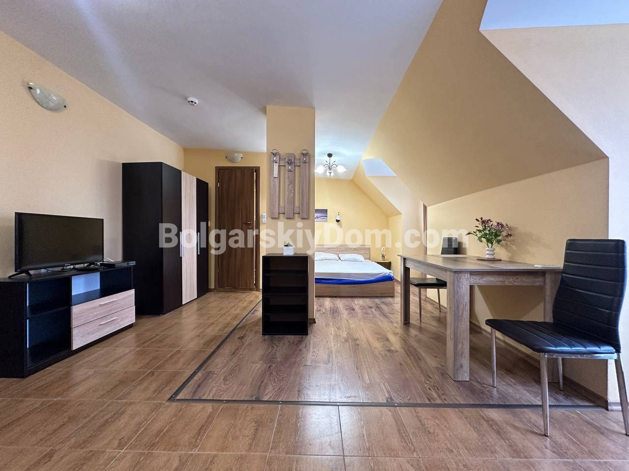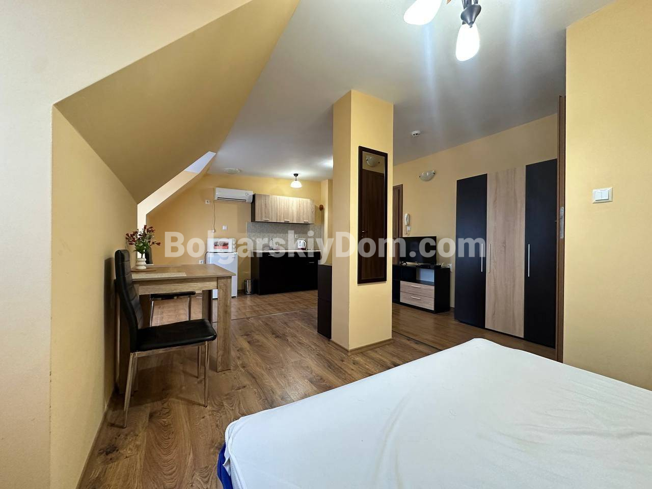 Свет, воздух и вид на море — студия со своим индивидуальным характером в комплексе Горизонт, расположенном в тихом зеленом районе на стыке курортов Солнечный берег и Святой Влас. Эта квартира на последнем, пятом этаже комплекса — не просто квадратные метры, а пространство с настроением. Площадь 40 кв. м продумана до мелочей: интересная круговая планировка создаёт ощущение движения и лёгкости. Справа — аккуратная кухонная зона, где всё под рукой. Слева, в уютной нише за колонной, спрятано спальное место — личный уголок уединения. Между ними — обеденная зона, которая объединяет всё пространство, делая его по-настоящему домашним. А за стеклянной дверью — небольшая терраса с видом, от которого трудно оторваться: бескрайний курорт и море на горизонте.