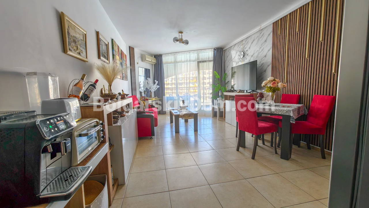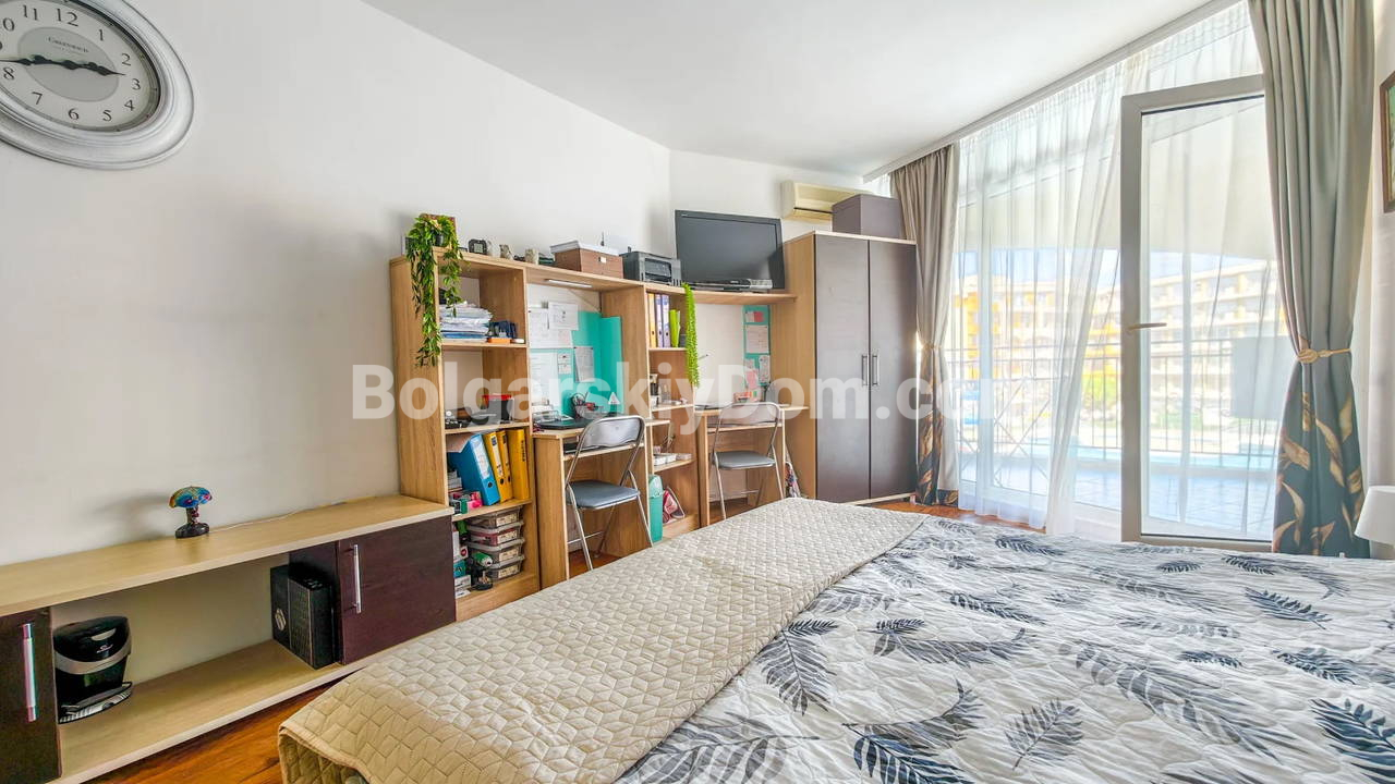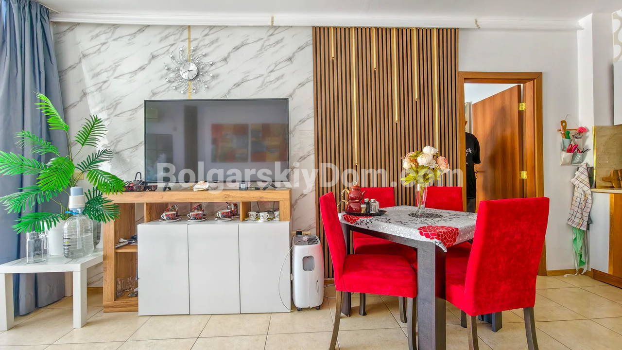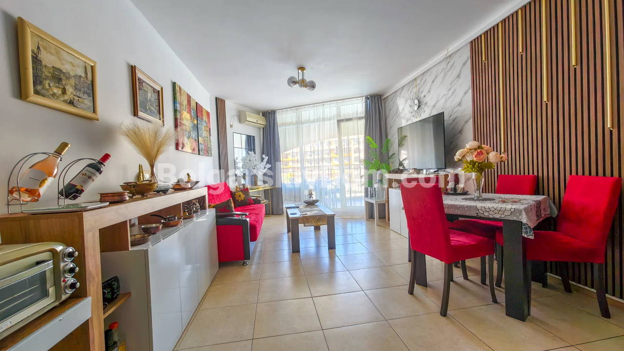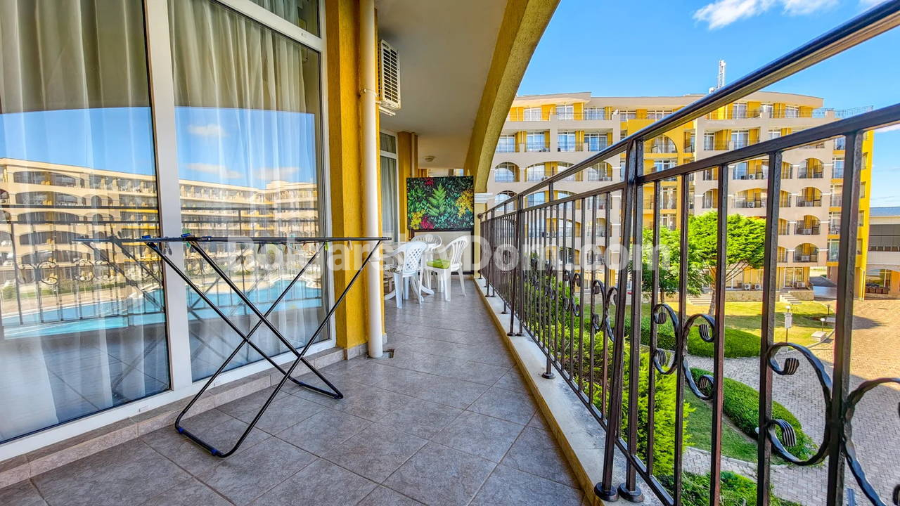 Топ-пополнение в каталоге видовых объектов! Агентство Болгарский Дом представляет просторную двухкомнатную квартиру площадью 72 кв.м. с невероятно красивым видом на море и большой бассейн! Этот апартамент находится на 2 этаже здания с лифтом в комплексе Мидия Гранд Резорт. Квартира полностью укомплектована всей необходимой мебелью и техникой, находится в отличном состоянии и готова к немедленному заселению. Планировка идеальна: прихожая, просторная гостиная с кухонной зоной, спальня, которая имеет дополнительный бонус - собственную гардеробную, ванная комната и большой балкон.