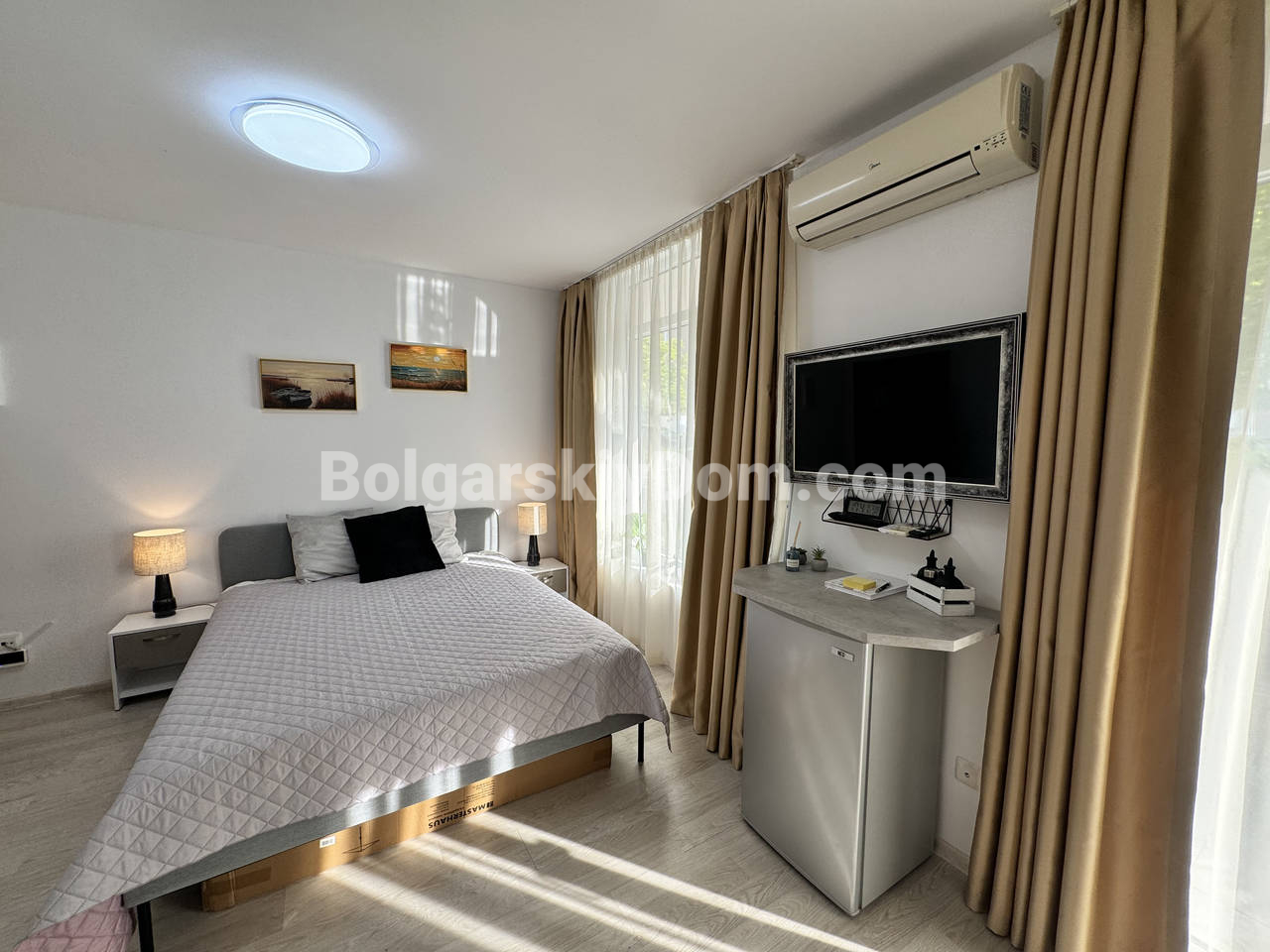 Новинка в категории топ-инвестиций! Болгарский Дом предлагает светлую и стильную студию площадью 37 кв.м. на Солнечном Берегу, расположенную на первом этаже комплекса Даун Парк. Интерьер выполнен в современном минималистичном стиле с гармоничным сочетанием белого и бежевого цветов, что создает ощущение простора и света. Внутри есть всё необходимое: полностью оборудованная кухонная зона с практичной стиральной машиной и удобными шкафчиками. А спальная зона оснащена комфортным двуспальным местом и шкафом. Особое преимущество - просторная, уютная терраса с мебелью, которая выходит прямо в зеленый двор комплекса, идеальное место для утреннего кофе.