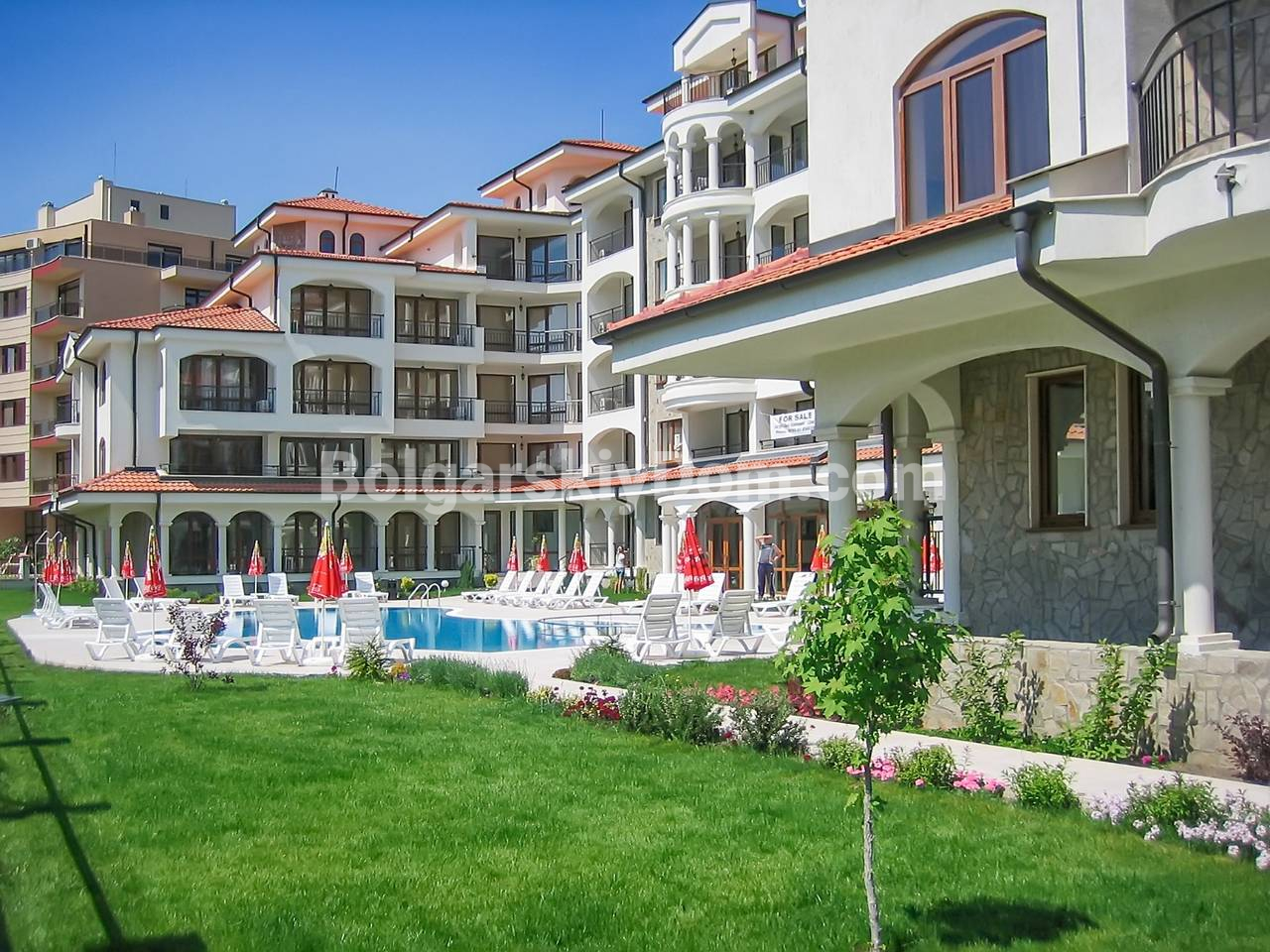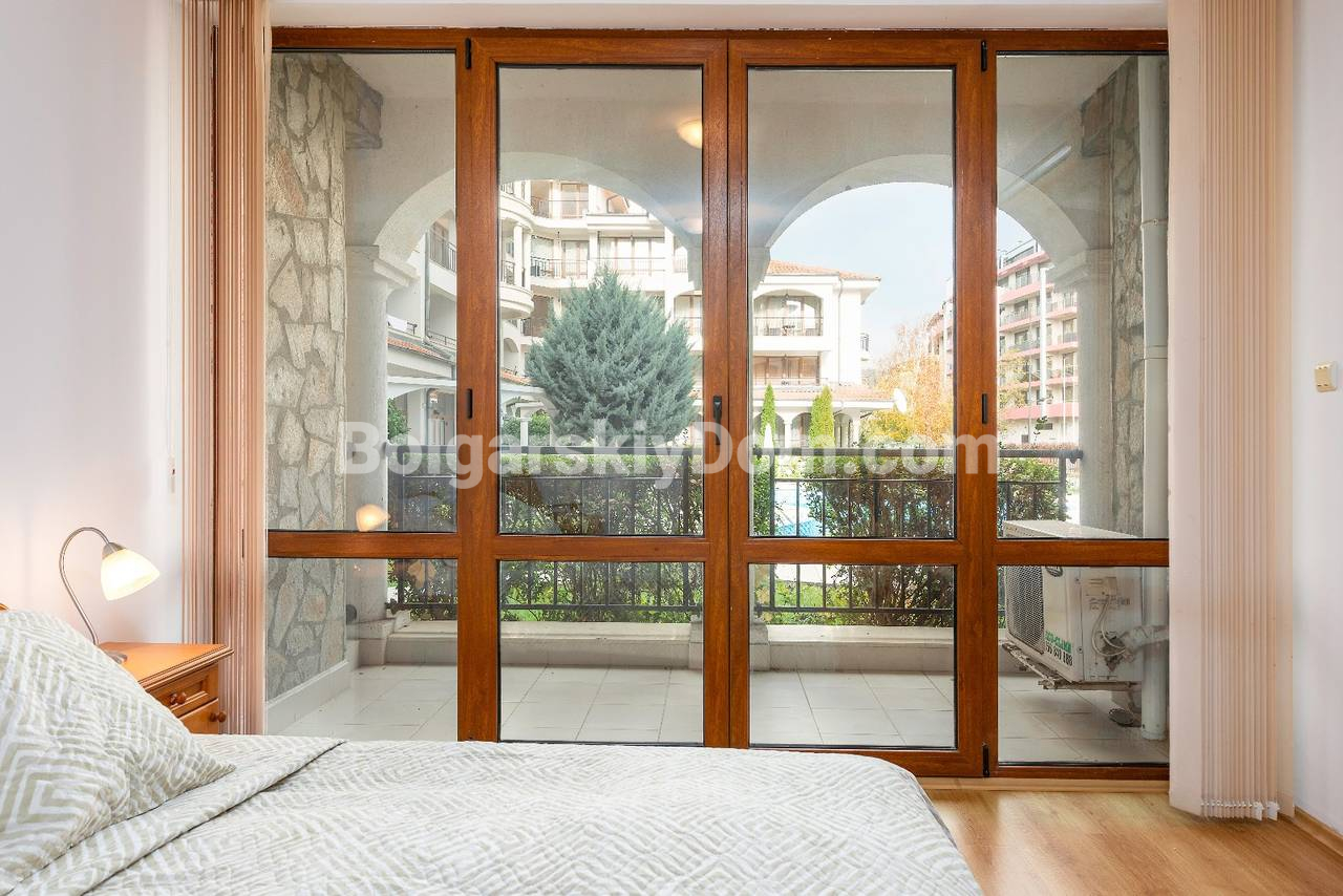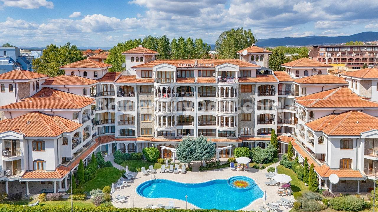 Уютная, обустроенная и довольно просторная квартира с одной спальней в средиземноморском стиле на Солнечном Берегу! Агентство Болгарский Дом представляет апартамент квадратурой 91 кв.м. в комплексе Шато Дель Мар. Это действительно внушительный метраж для двух комнат, а значит, этот параметр обеспечивает максимальный комфорт. А что обеспечивает экономию, так это прайс: он чуть больше 1000 евро за кв.м.! Квартира расположена на первом этаже, откуда открывается красивый вид на бассейн и ландшафтный дизайн территории. Планировка включает прихожую, большую гостиную с зонами кухни и столовой, отдельную спальню и балкон. Недвижимость полностью меблирована и находится в прекрасном состоянии.