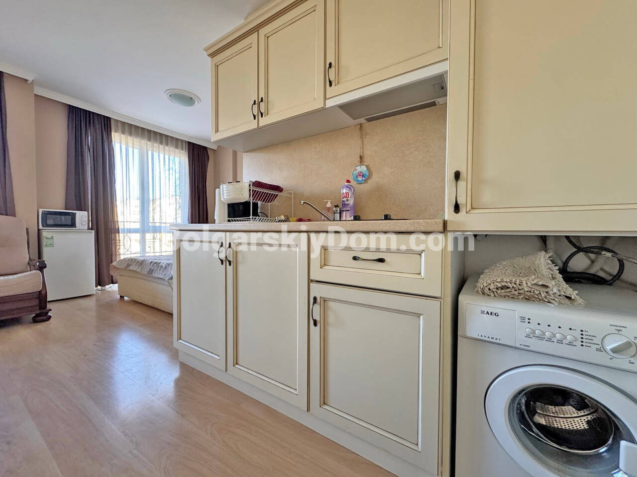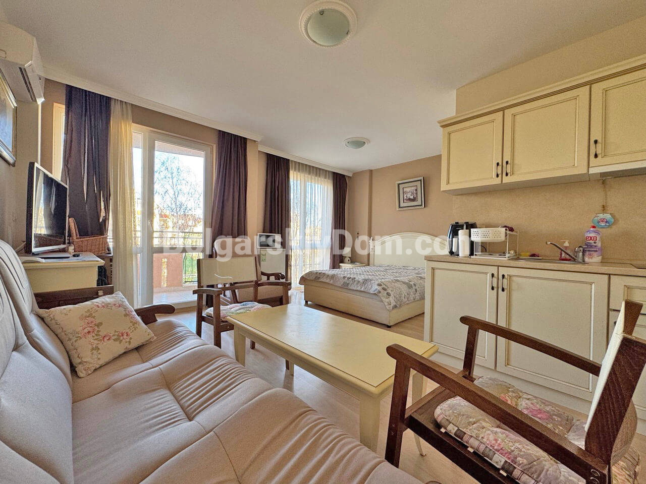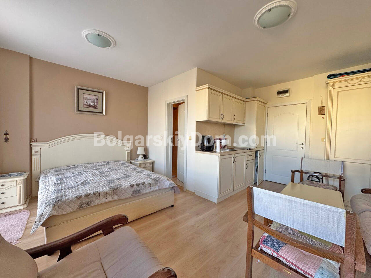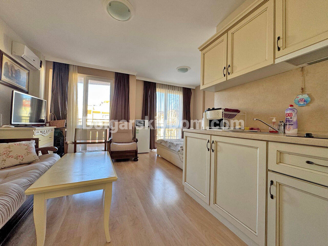 Готовы к новинке, мимо которой сложно пройти? Для тех, кто ищет ликвидную недвижимость в центре курорта, эта студия площадью 41 кв.м. станет отличным приобретением, и команда АН Болгарский Дом уже готова к показам! Просторная жилая зона позволяет комфортно разместить не только спальное место, но и полноценный кухонный блок со столовой группой. Квартира расположена на третьем этаже, что является золотой серединой: это не последний этаж, но при этом из окон открывается приятный вид. Наличие прихожей помогает грамотно организовать хранение вещей, а терраса станет любимой зоной отдыха. Объект полностью готов к сделке, есть Акт 16 и высокий потенциал для сдачи в аренду.