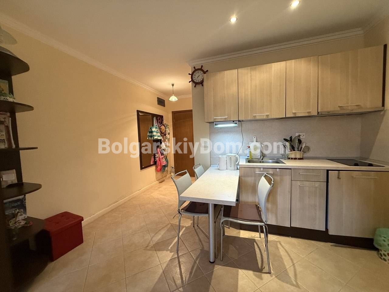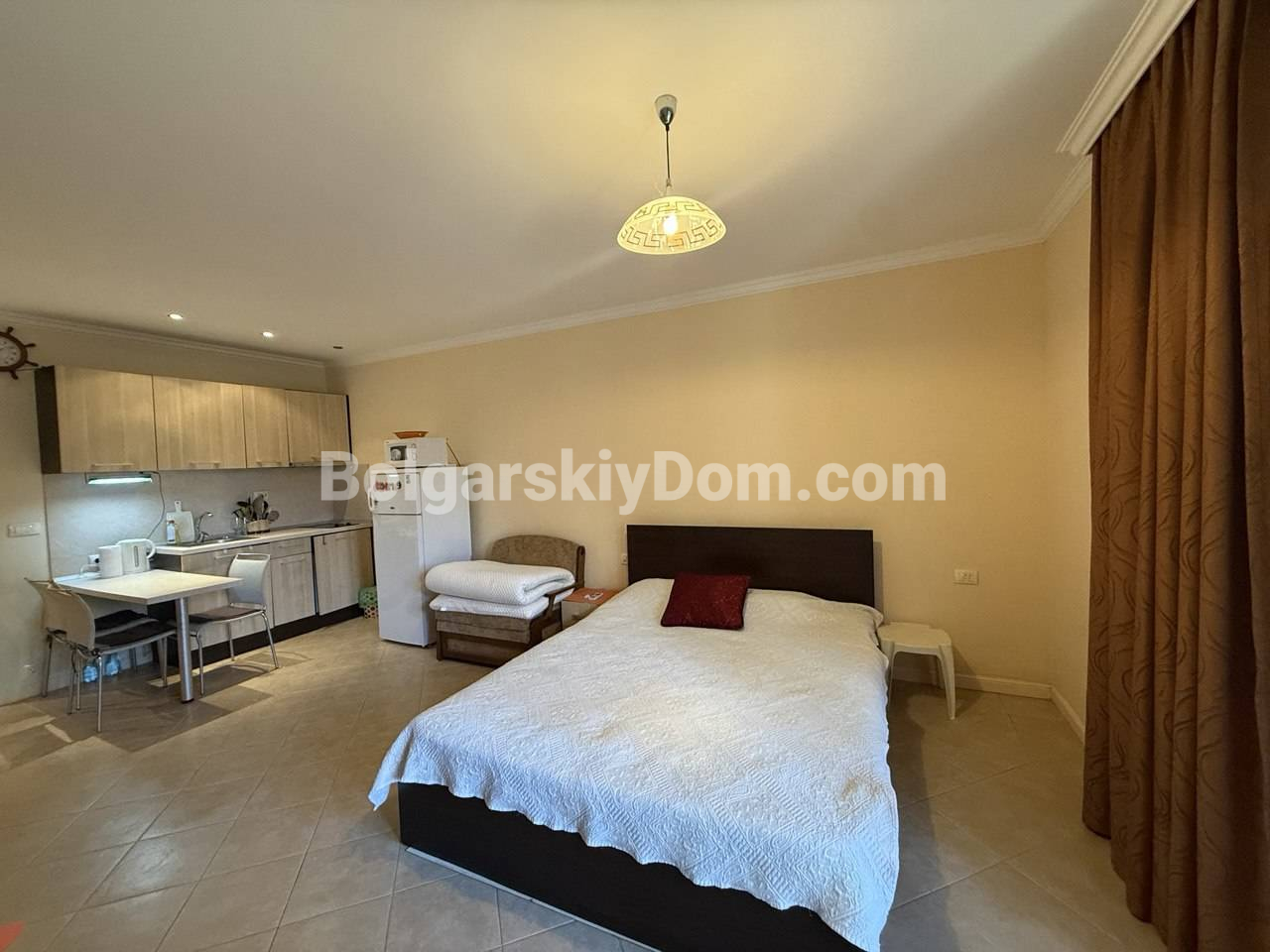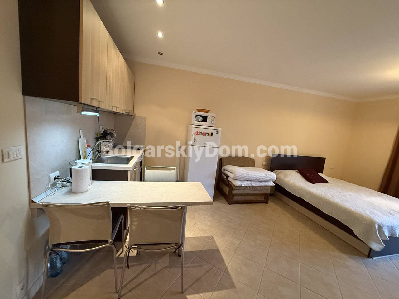 Встречайте новинку из Созополя в каталоге Болгарского Дома - светлую и ухоженную студию площадью 44 квадратных метра! Она расположена на первом этаже, поэтому вы получаете легкий доступ к дому прямо с прогулочных аллей. Пространство организовано грамотно: внутри выделена полноценная кухонная зона с обеденным столом, стоит удобная двуспальная кровать и продуманы места для хранения вещей. Квартира продается под ключ и находится в прекрасном состоянии, так что после сделки можно сразу заезжать или запускать объект в аренду как готовый бизнес-актив.