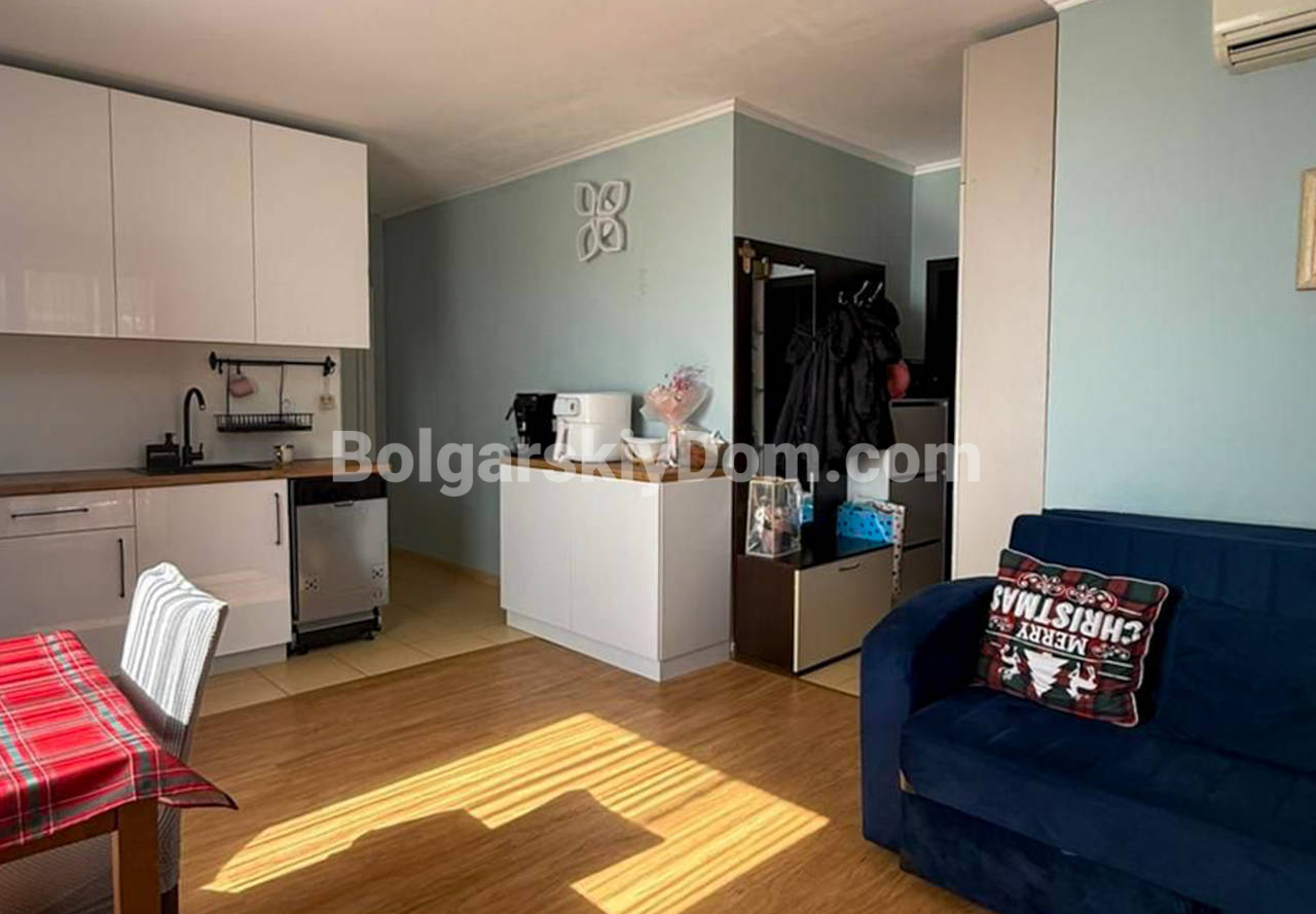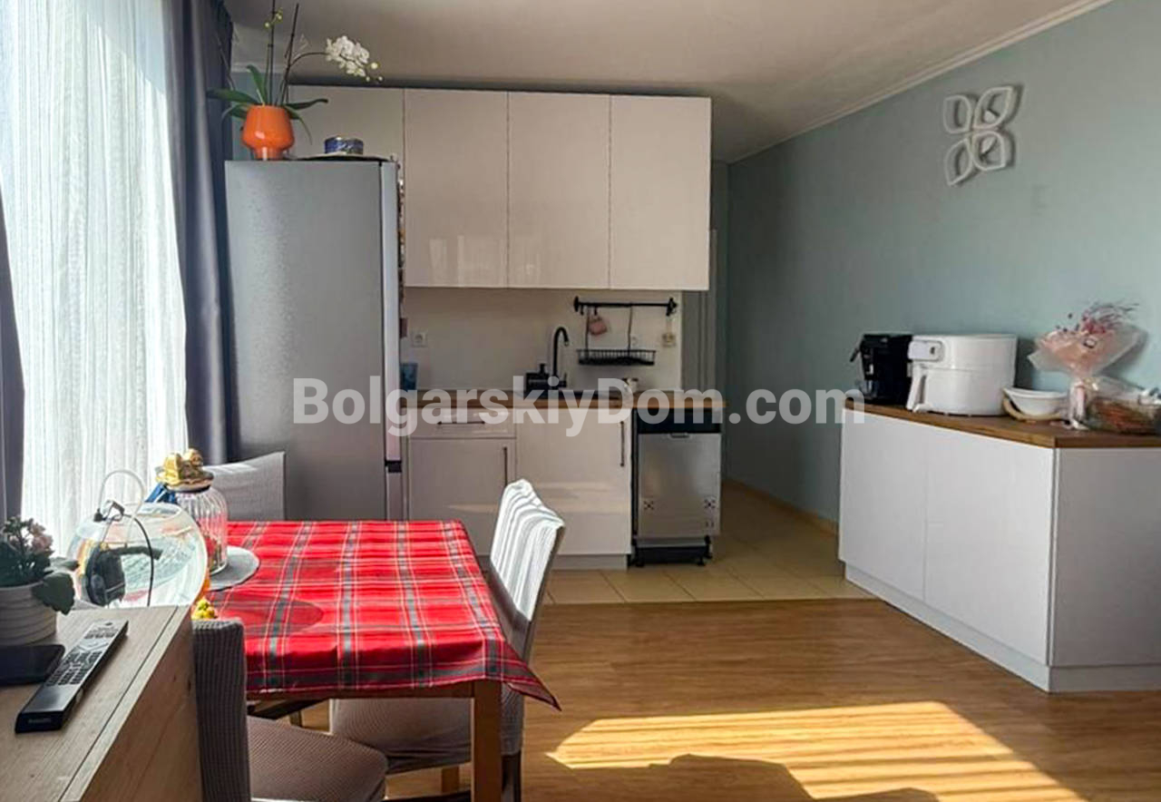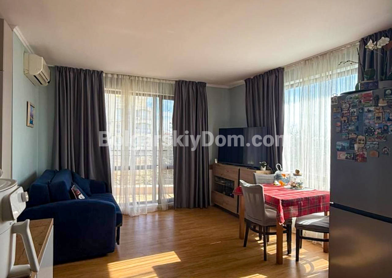 Встречайте ликвидный апартамент! АН Болгарский дом представляет квартиру 1+1 в Макон, Святой Влас - южная сторона с видом на море! Метраж 65,5 кв.м, второй этаж. Квартира типа «распашонка» с двумя балконами: с одного восход, с другого закат - такое расположение редко встречается. Мебель абсолютно новая, оставляется полностью. Техника: индукционная плита, посудомойка, холодильник, стиральная машинка (размещена в санузле), телевизор. Спальня оборудована большой кроватью с подъемным механизмом, что удобно при хранении вещей. Входная дверь недавно заменена. Ориентация на юг означает, что зимой квартира хорошо согревается естественным светом, летом воздушная циркуляция по двум балконам спасает от перегрева.