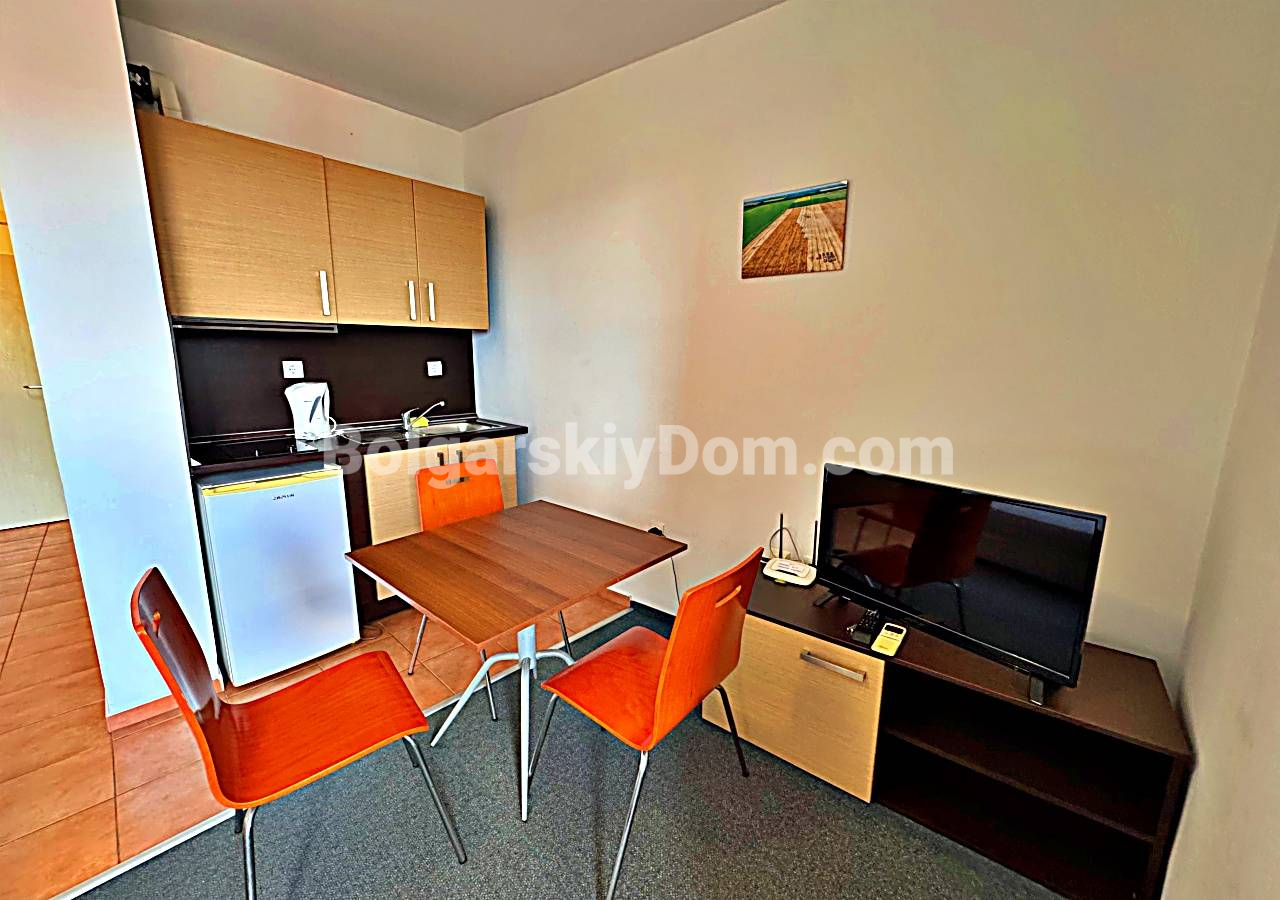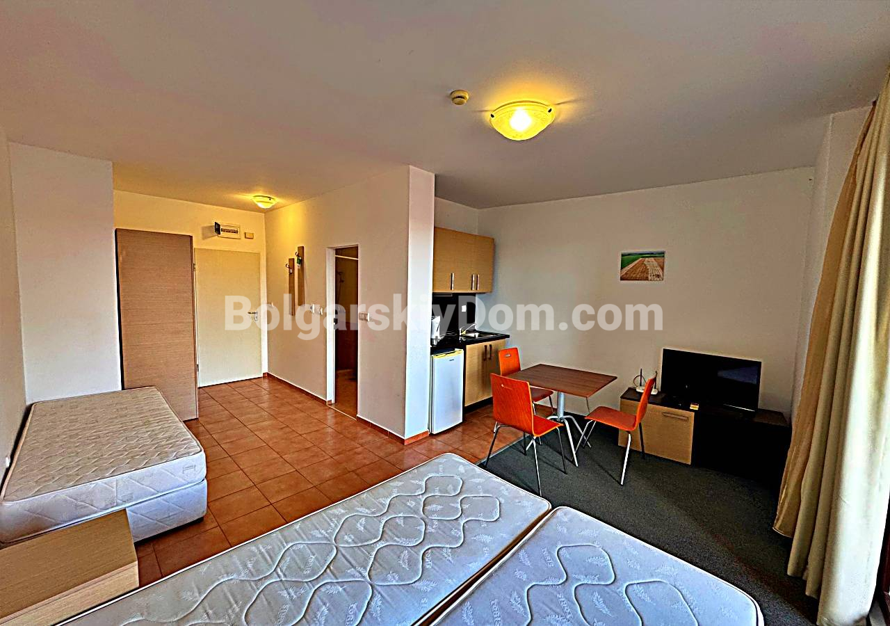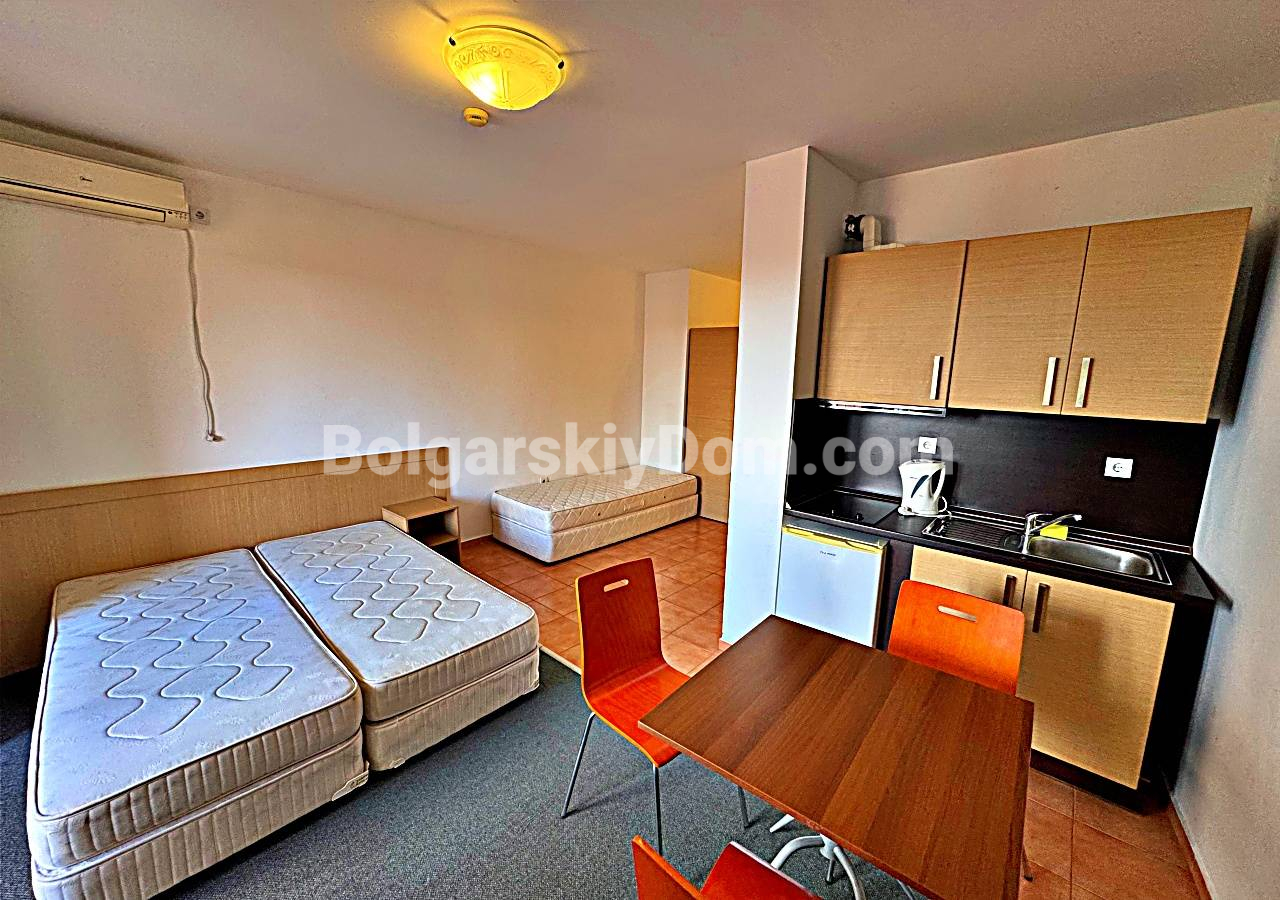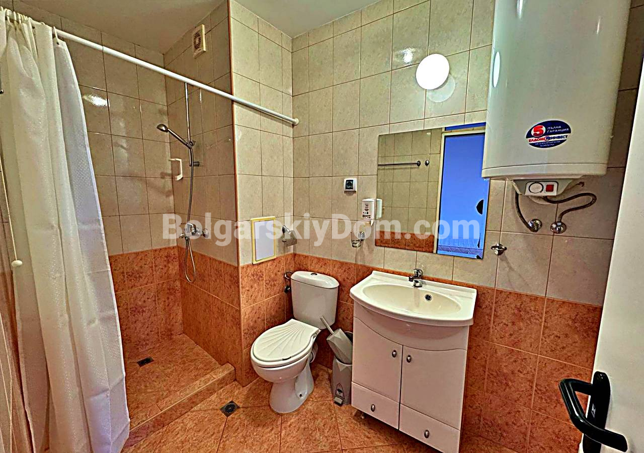 Свежее и выгодное предложение от Болгарского Дома! Просторная студия прямо на первой береговой линии в комплексе Марина Кейп в тихом курортном городке Ахелой. Объект на 4-м этаже пятиэтажного кирпичного дома 2012 года постройки с лифтом. Метраж 41 кв.м. включает прихожую, большую комнату (гостиная + кухонный уголок + спальное место), санузел с душем и террасу с видом на бассейн комплекса и зелёную территорию. Студия обставлена мебелью, укомплектована бытовой техникой - светлая, удобная, подходит для 2-3 человек, готова к заезду или посуточной сдаче в сезон.