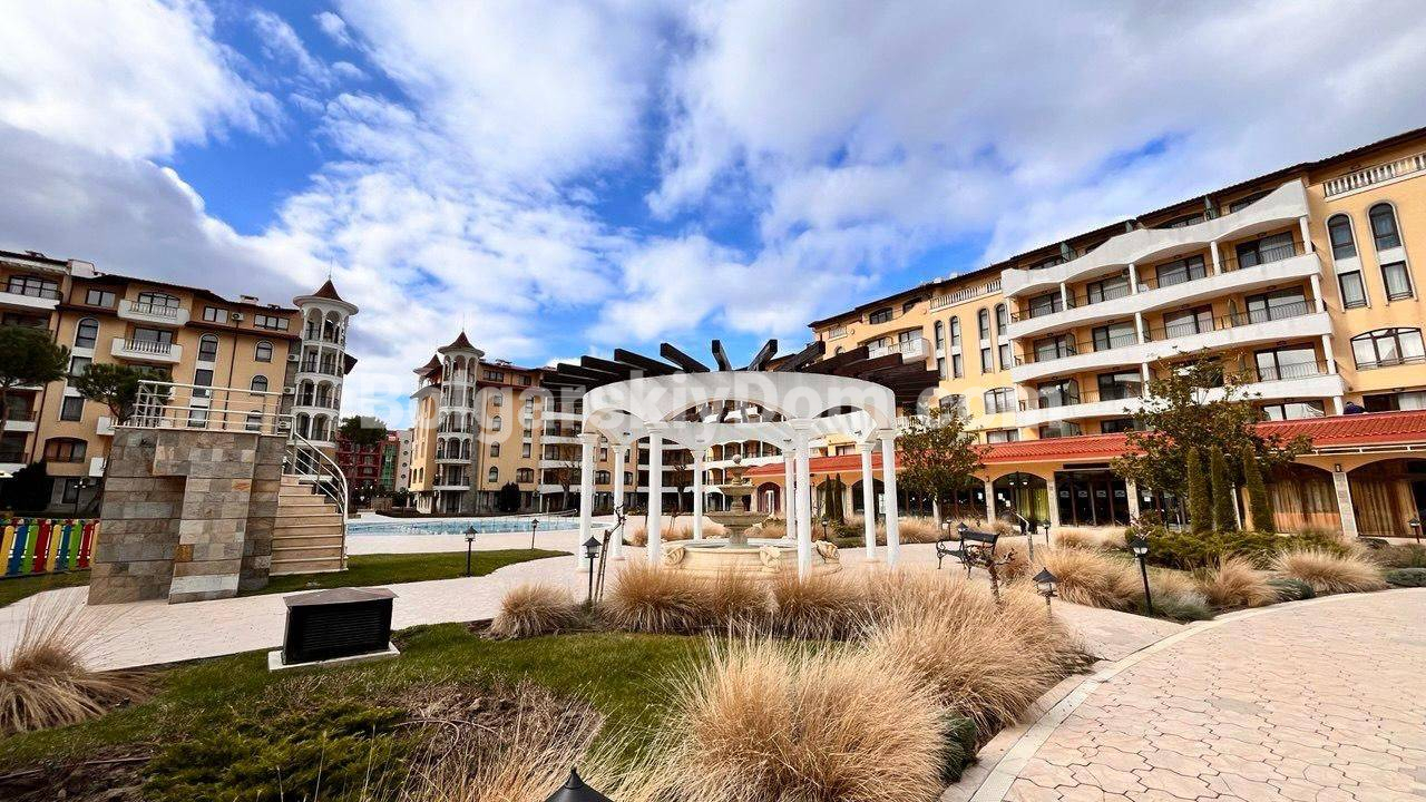 Комплекс Роял Сан - один из самых популярных и ухоженных в центре курорта: три открытых бассейна с детской зоной, СПА-центр с массажем и сауной, фитнес-зал, ресторан и лобби-бар, детская площадка, супермаркет на территории, круглосуточная охрана с видеонаблюдением, охраняемая парковка и лифты. До песчаного пляжа примерно 500 метров - пешком 7-10 минут по удобной дороге. Район живой и удобный: рядом крупные магазины, кафе, аптеки, остановки транспорта, аквапарк и вся курортная инфраструктура. Такса поддержки составляет 22 евро за кв.м. в год (включает все услуги комплекса: бассейны, уборка, охрана, обслуживание). В Акт 16, свяжитесь с нами, чтобы и обсудить детали!