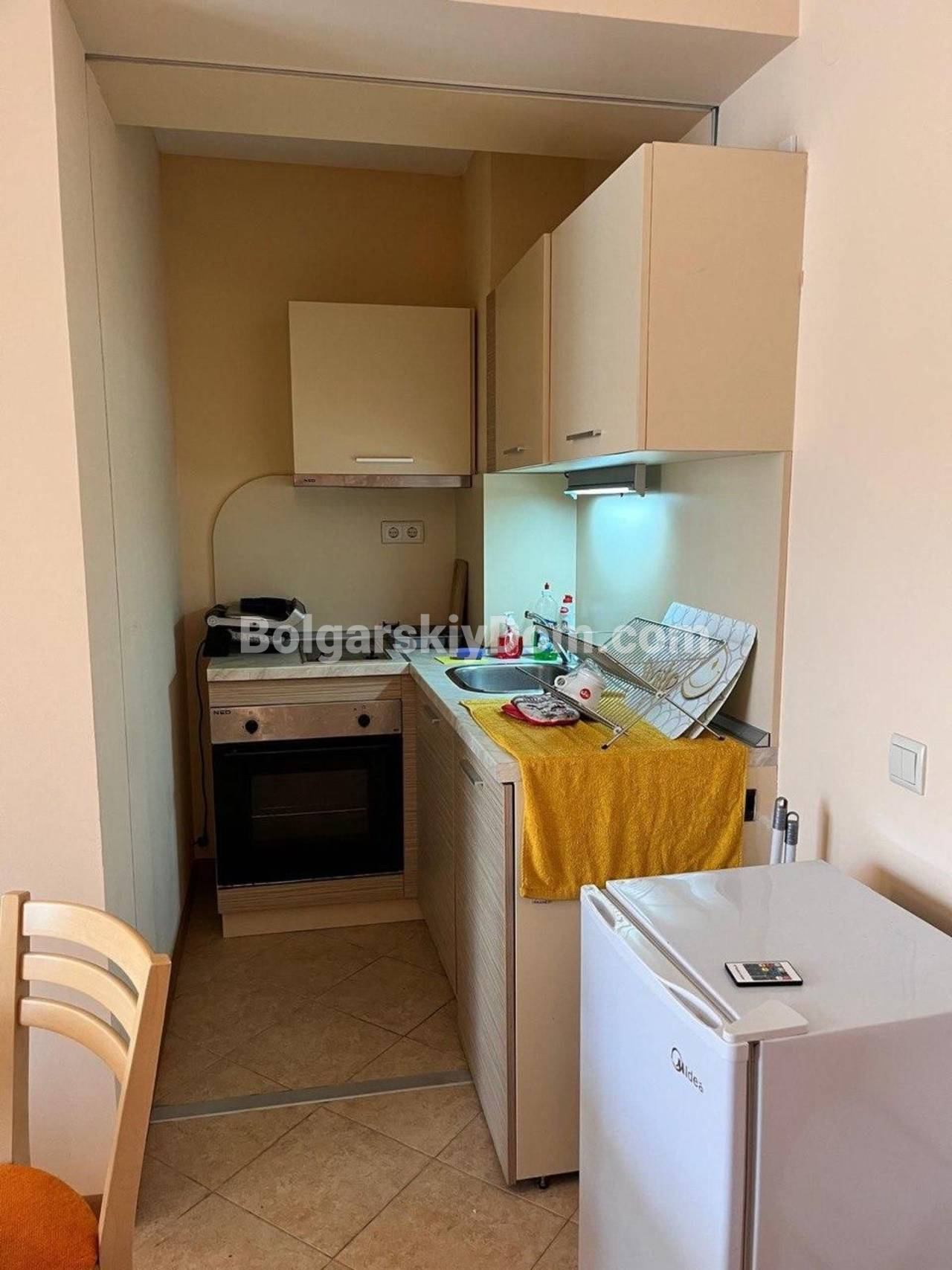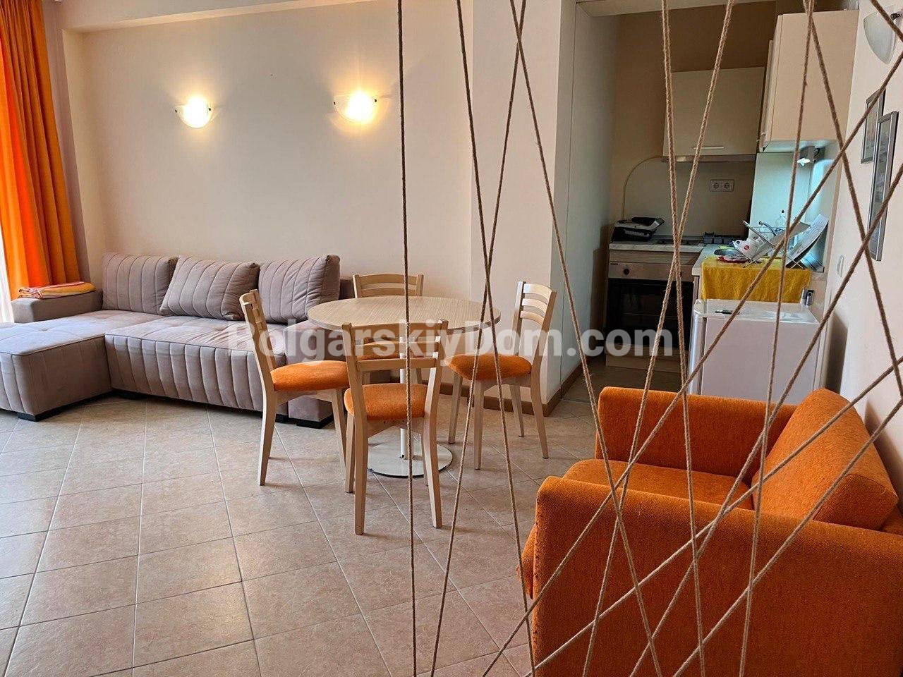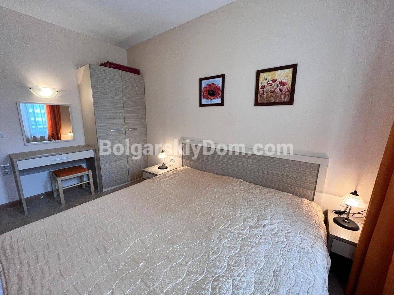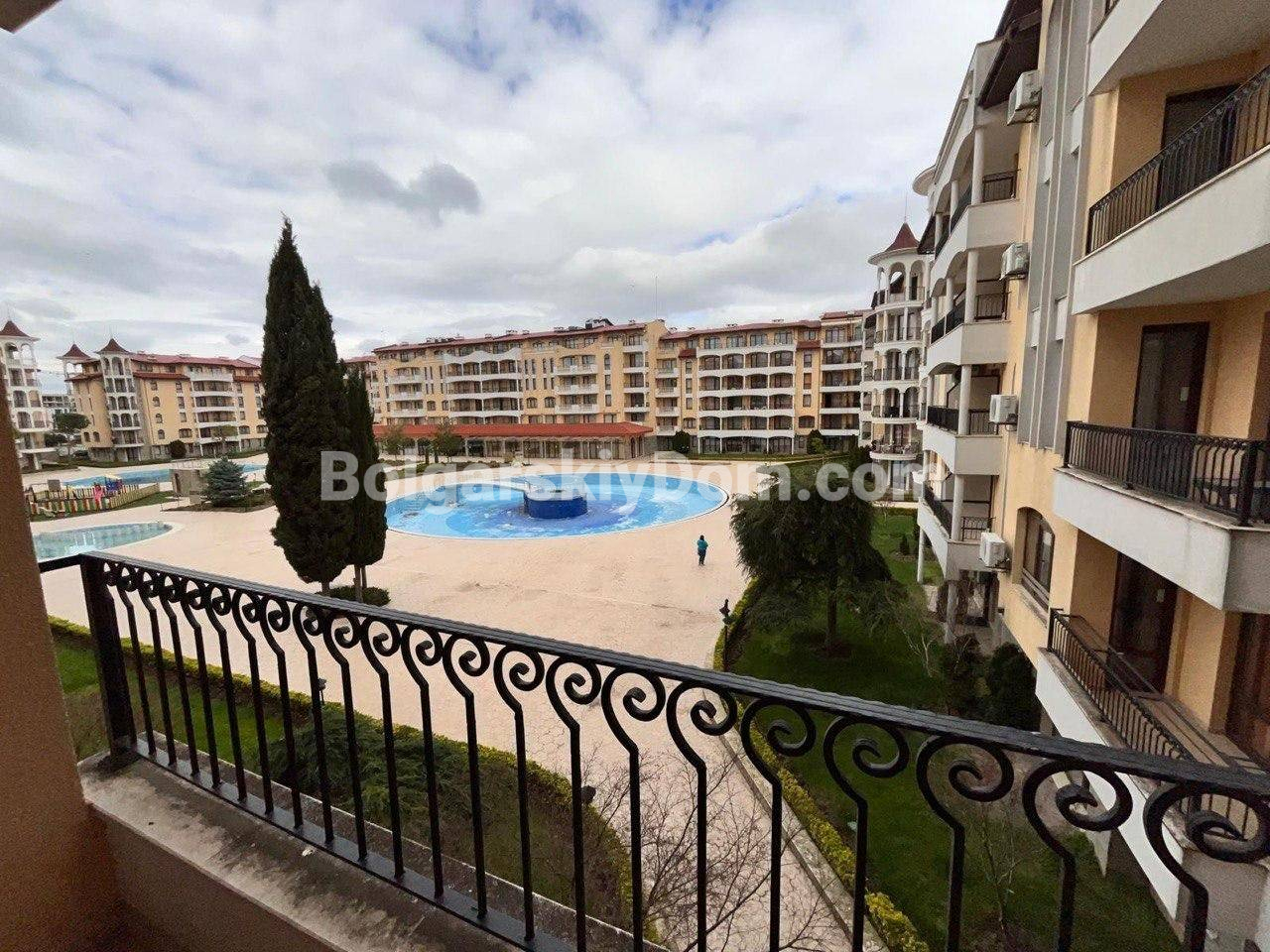 Новое предложение от Болгарского Дома! Ухоженная и полностью меблированная двухкомнатная квартира в комплексе Роял Сан в хорошем районе Солнечного Берега. Квадратура 58 кв.м., расположена на 3-м этаже шестиэтажного здания с лифтом. Здесь несмотря на небольшой метраж удобная планировка: гостиная с кухонным блоком, отдельная спальня, санузел с полноценной ванной (не душевой кабиной), а также терраса с видом на бассейн и зеленую территорию комплекса. Квартира оснащена всем необходимым для комфортного проживания - мебель в хорошем состоянии, бытовая техника, кондиционер, готовый полный комплект для заезда.