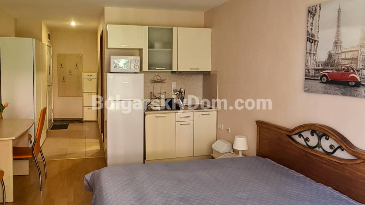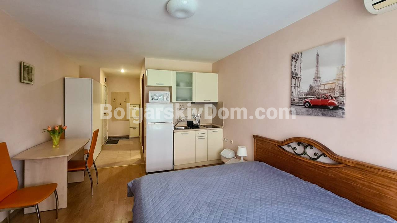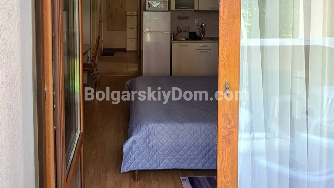 Инвестиционная недвижимость на первой линии! Агентство Болгарский Дом представляет студию в элитном комплексе Престиж Форт Бич в Святом Власе - жилье на морском побережье в одном из самых престижных курортов. Площадь 35 кв.м., расположена на первом этаже. Это компактная, но уютная квартирка: спальная зона с двуспальной кроватью, небольшая кухня с необходимой техникой, современный санузел со стиральной машиной и душевой кабиной. Мебель простая и практичная - деревянные кровати, шкафы для хранения, удобные стулья. Из окна и с балкона открывается вид на озелененную территорию комплекса и бассейны. Квартира полностью меблирована и готова к использованию. Акт 16. Такса поддержки 16 евро за кв.м в год - справедливая цена для престижного комплекса на первой линии.