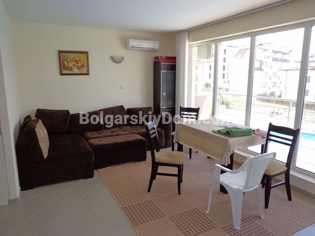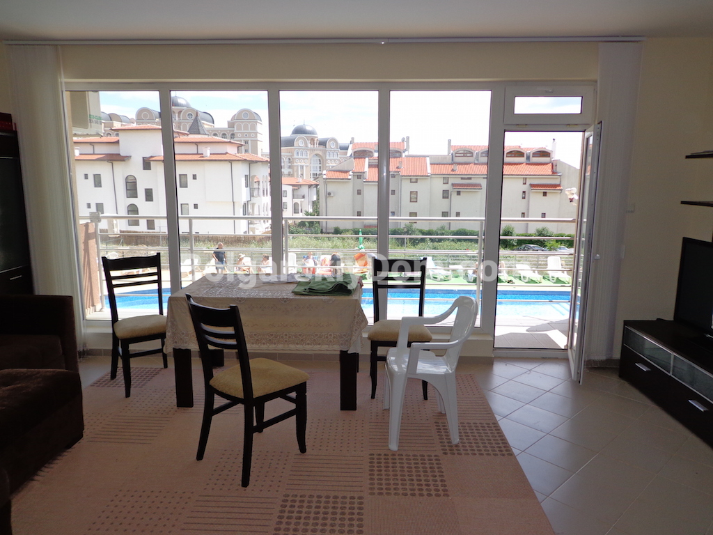 Расстояние до центра к.к. Солнечного берега не более 2 км, аэропорта г.Бургаса – 30 км, г. Варны – 100 км. Пляж – 300 м.