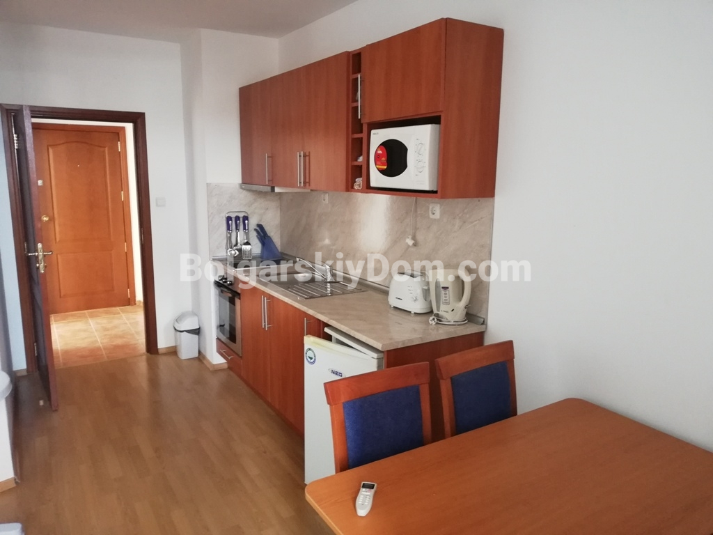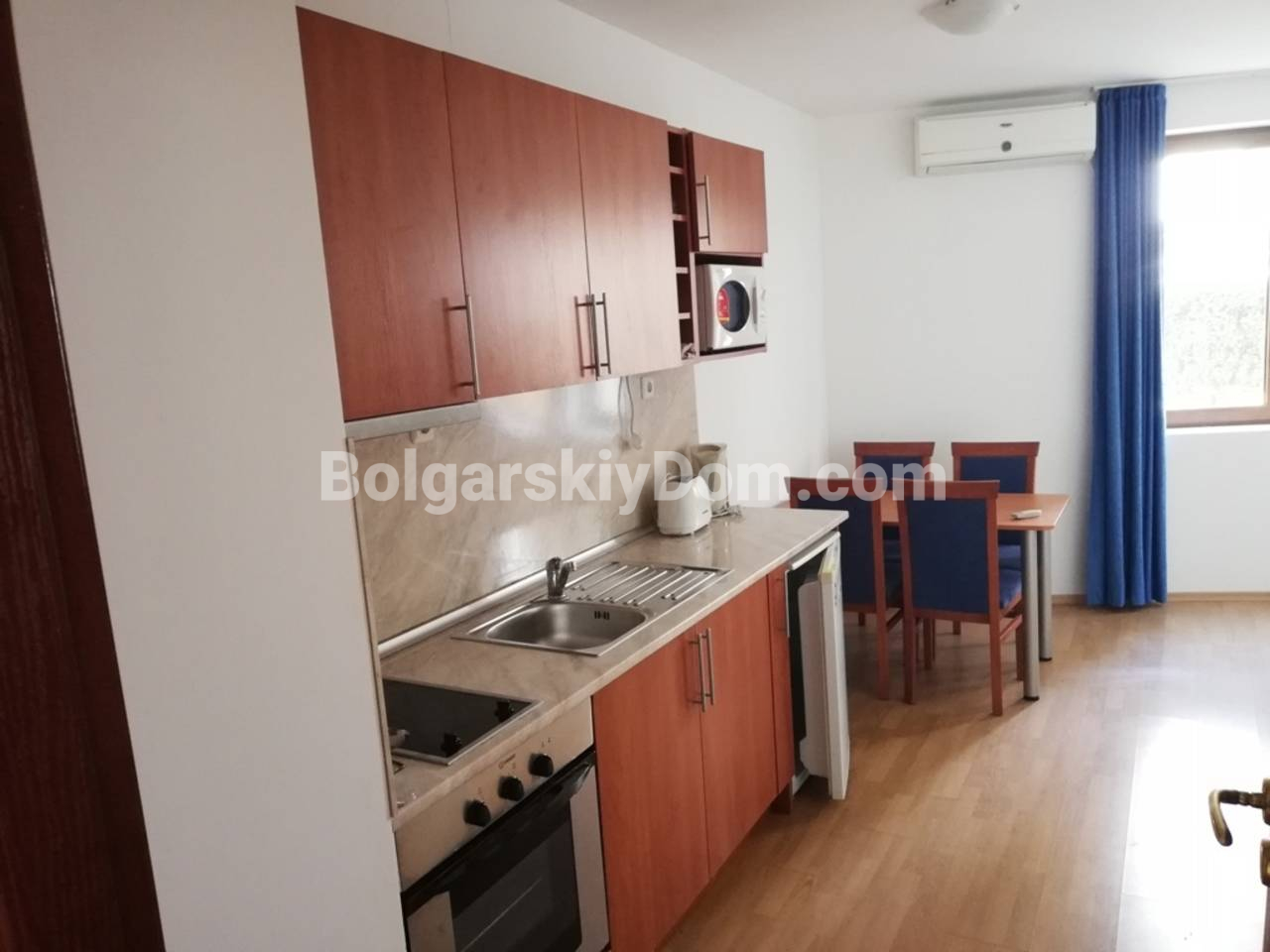 Каталог недвижимости на Солнечном берегу вновь пополнился отличным и стоящим вашего внимания объектом! В курортном комплексе Кассандра выставлена на продажу меблированная двухкомнатная квартира, которая расположена на первом этаже. Недвижимость площадью 56 кв. м. полностью готова к заселению новых собственников или сдаче в аренду – весь ее интерьер вместе с техникой и мебелью включен в обозначенную стоимость. Из гостиной есть выход к частной зеленой зоне, небольшому английскому дворику, который может использоваться в качестве места для загара или отдыха.
